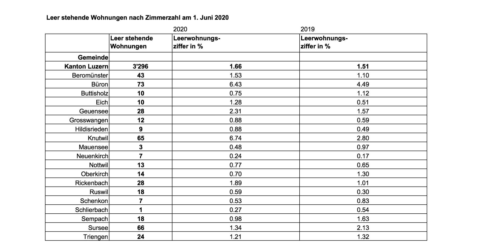 Eine Abnahme ihrer Leerwohnungsziffern verzeichneten fünf Regionen (Stadt Luzern, Rooterberg/Rigi, Sursee/Sempachersee, Willisau, Seetal). In der Stadt Luzern lag der Leerwohnungsanteil unterhalb des kantonalen Mittels: 2020 waren 538 Wohnungen oder 1,16 Prozent des städtischen Wohnungsbestands unbesetzt.