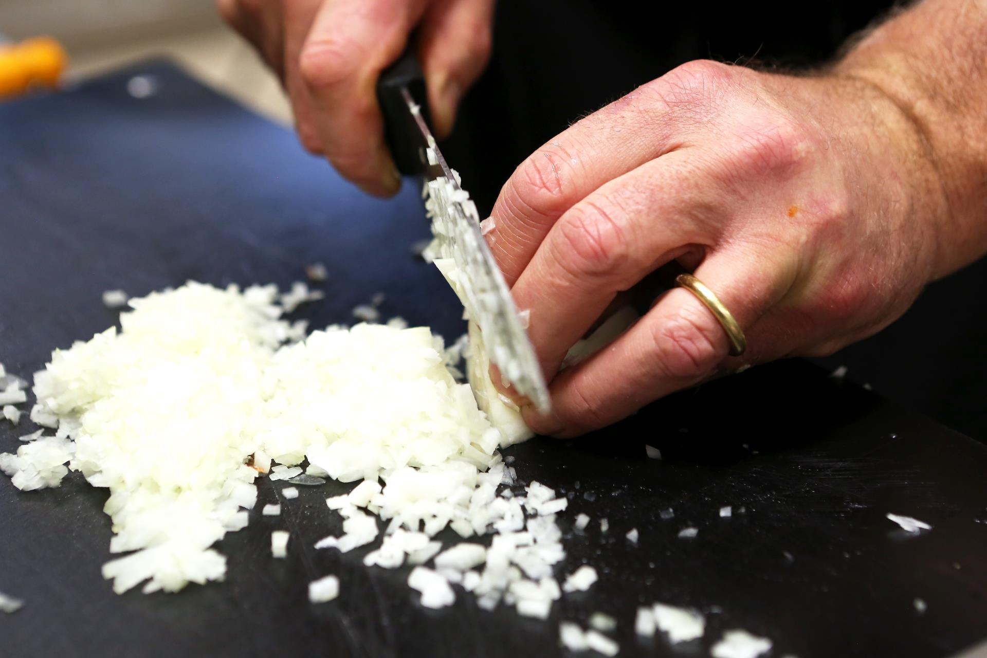 Beat Amrein greift mit der linken Hand eine Zwiebel, in der rechten Hand hält er ein langes Messer. «Das Messer muss scharf sein», betont er und schon fliegen die Schalenteile weg, so dass der 52-Jährige die Zwiebel halbieren kann. Mit dem Gemüsemesser schneidet er die hälftige Zwiebel quer ein.