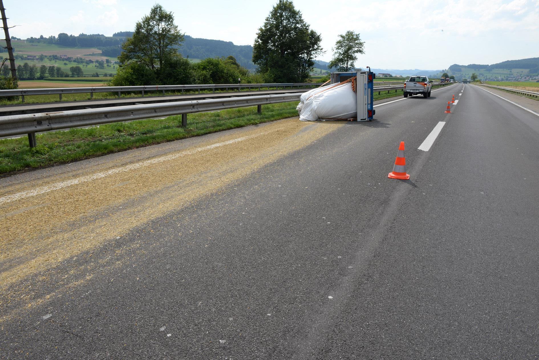 Am Dienstagnachmittag, 18. Juli, um 16 Uhr, fuhr ein Lieferwagen mit beladenem Anhänger auf der Autobahn A2 Richtung Norden. Nach der Knutwilerhöhe wollte die Lenkerin eines von einem Lastwagen heruntergefallenen Spanngurts ausweichen. Dabei geriet der mit Futtersäcken beladene Anhänger ins Schlingern und kippte auf der Überholspur zur Seite. Dabei wurde die Fahrbahn verunreinigt.