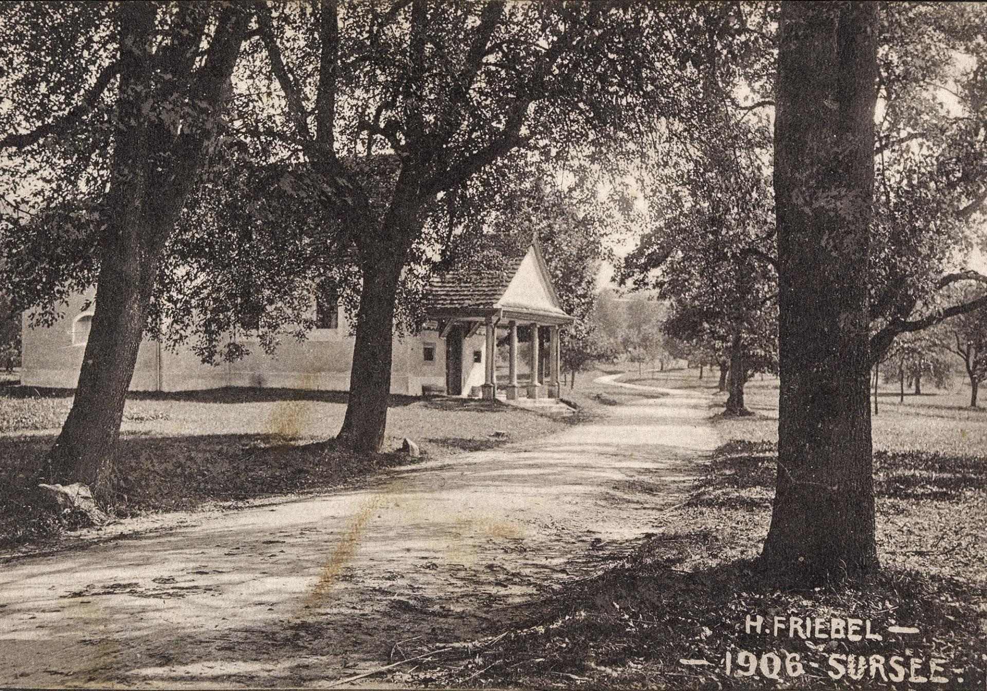 So malerisch präsentierte sich 1906 der Weg von Sursee nach Schenkon. Im Bild ist die im 17. Jahrhundert erbaute und dem Heiligen Anton von Padua geweihte Antoniuskapelle Schenkon. Die Aufnahme stammt von Hermann Friebel-Sahli.