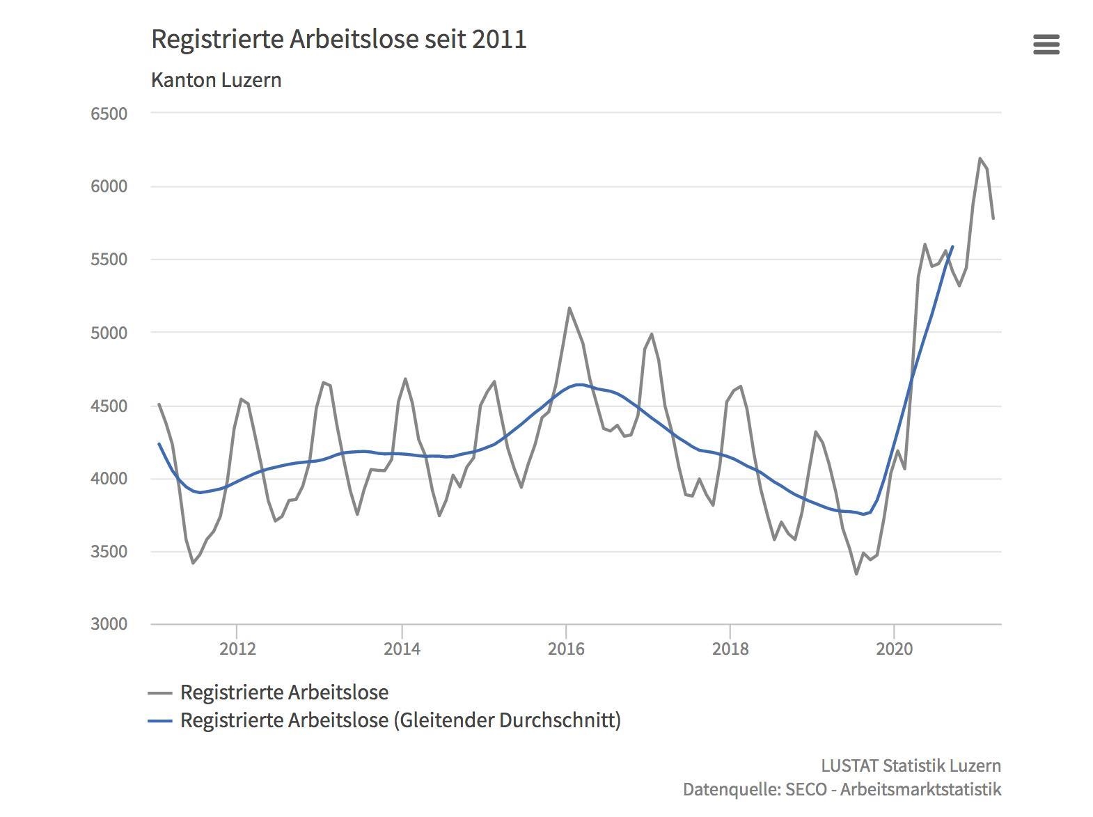 Im Vergleich zum März 2020 betrug der Anstieg der Arbeitslosen im Kanton Luzern 24,9 Prozent (+1153 Personen). In der Gesamtschweiz war der Anstieg mit 16,5 Prozent etwas weniger stark.