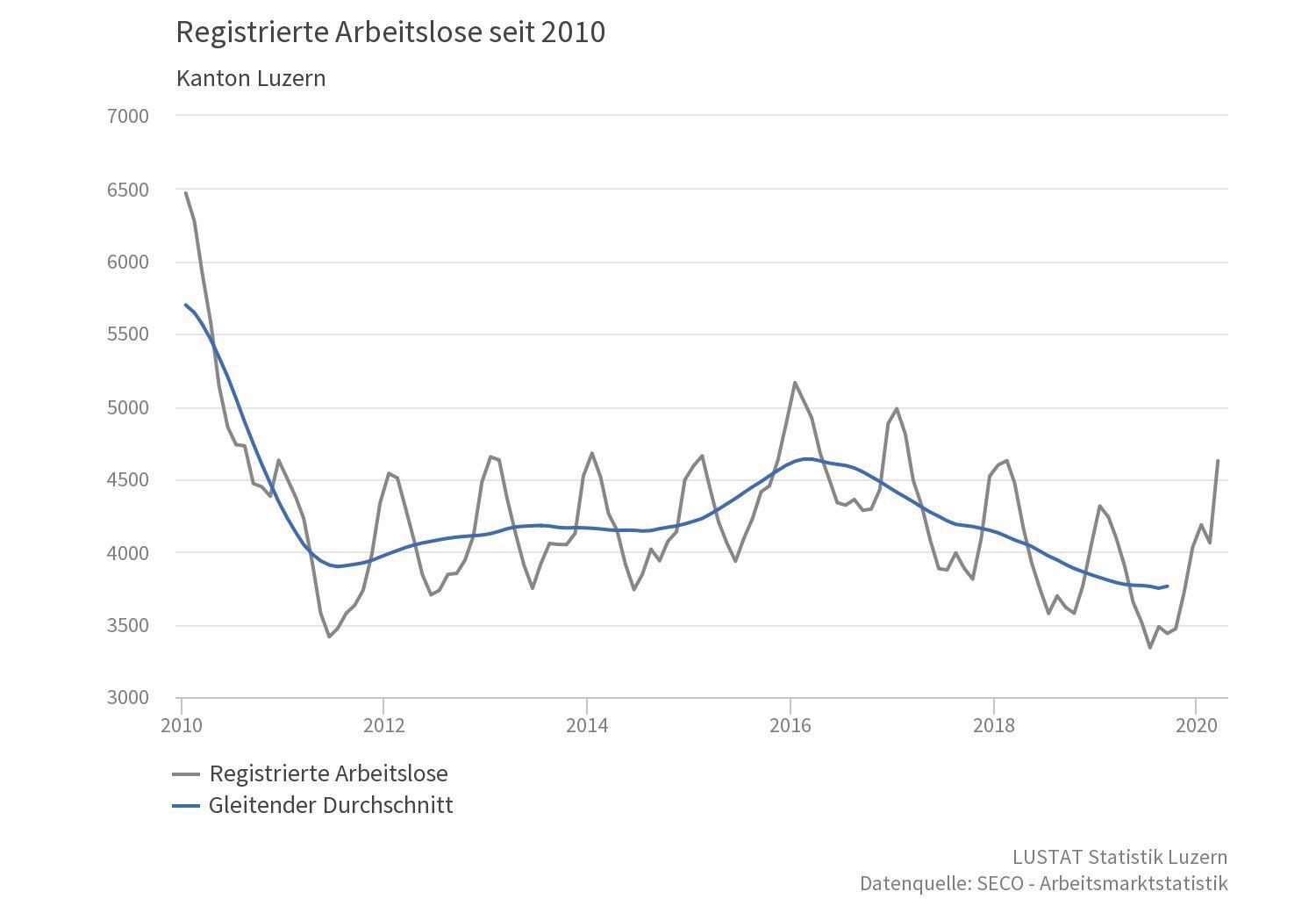 Derzeit beträgt die Zahl der Arbeitslosen (Ende März) 4626 Personen. Dies entspricht einem Anstieg um 12,9 Prozent gegenüber dem März 2019. Schweizweit betrug der Anstieg 20,7 Prozent. Zwischen Februar 2020 und März 2020 wuchs die Zahl der Arbeitslosen im Kanton Luzern um 564 Personen (+13,9 Prozent), Schweizweit betrug das Wachstum 15,1 Prozent. Somit stieg die Arbeitslosenquote zwischen Februar und März 2020 im Kanton Luzern um 0,3 Prozentpunkte von 1,7 auf 2,0 Prozent (CH: +0,4 Prozentpunkte von 2,5% auf 2,9%).