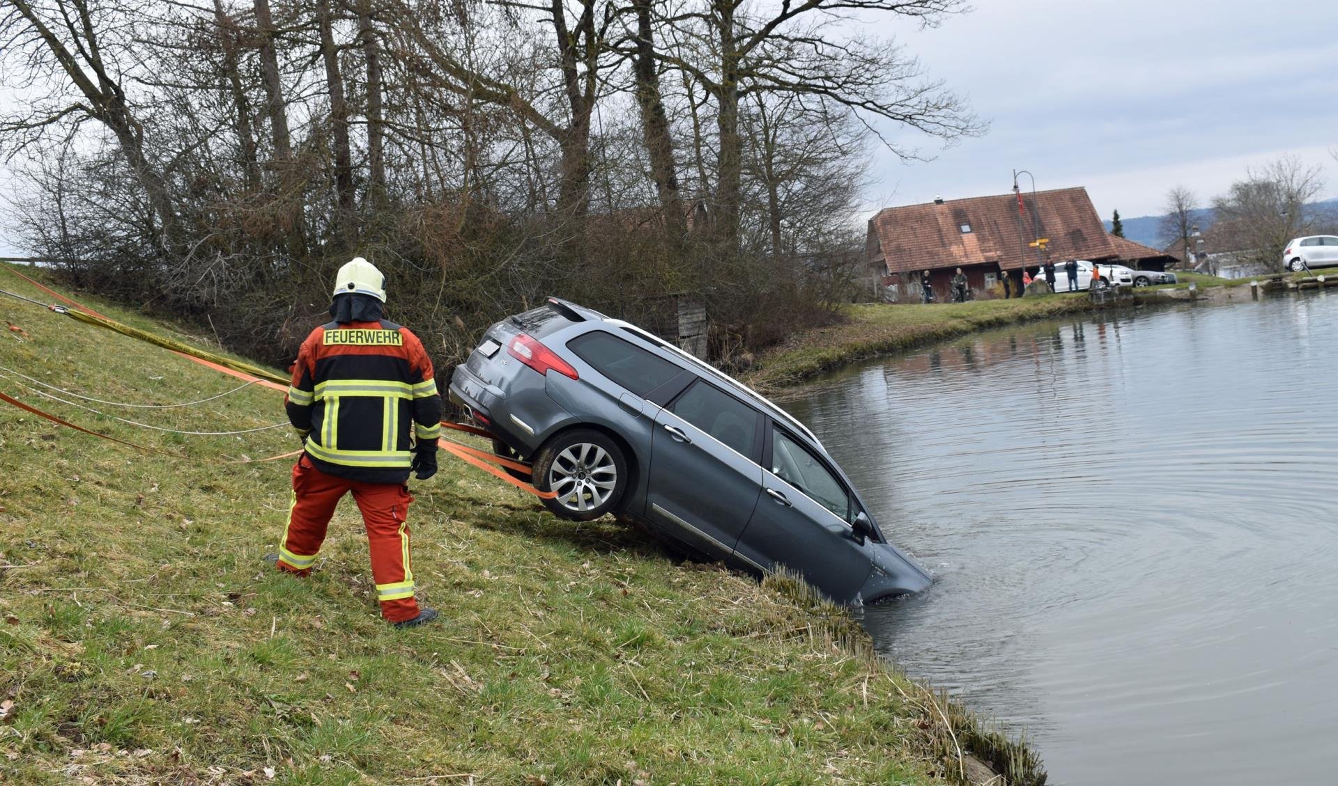 Kurz nach 13 Uhr am letzten Sonntag, 21. März, rollte ein Fahrzeug in Büron einen Abhang hinunter und geriet daraufhin mit der Fahrzeugfront in den Müliweier. Wie die Luzerner Polizei mitteilt, konnte sich der Fahrer selbstständig aus dem Fahrzeug befreien. Die Feuerwehr Büron-Schlierbach barg das Auto mit einer Seilwinde aus dem Weiher. Verletzt wurde beim Unfall niemand.