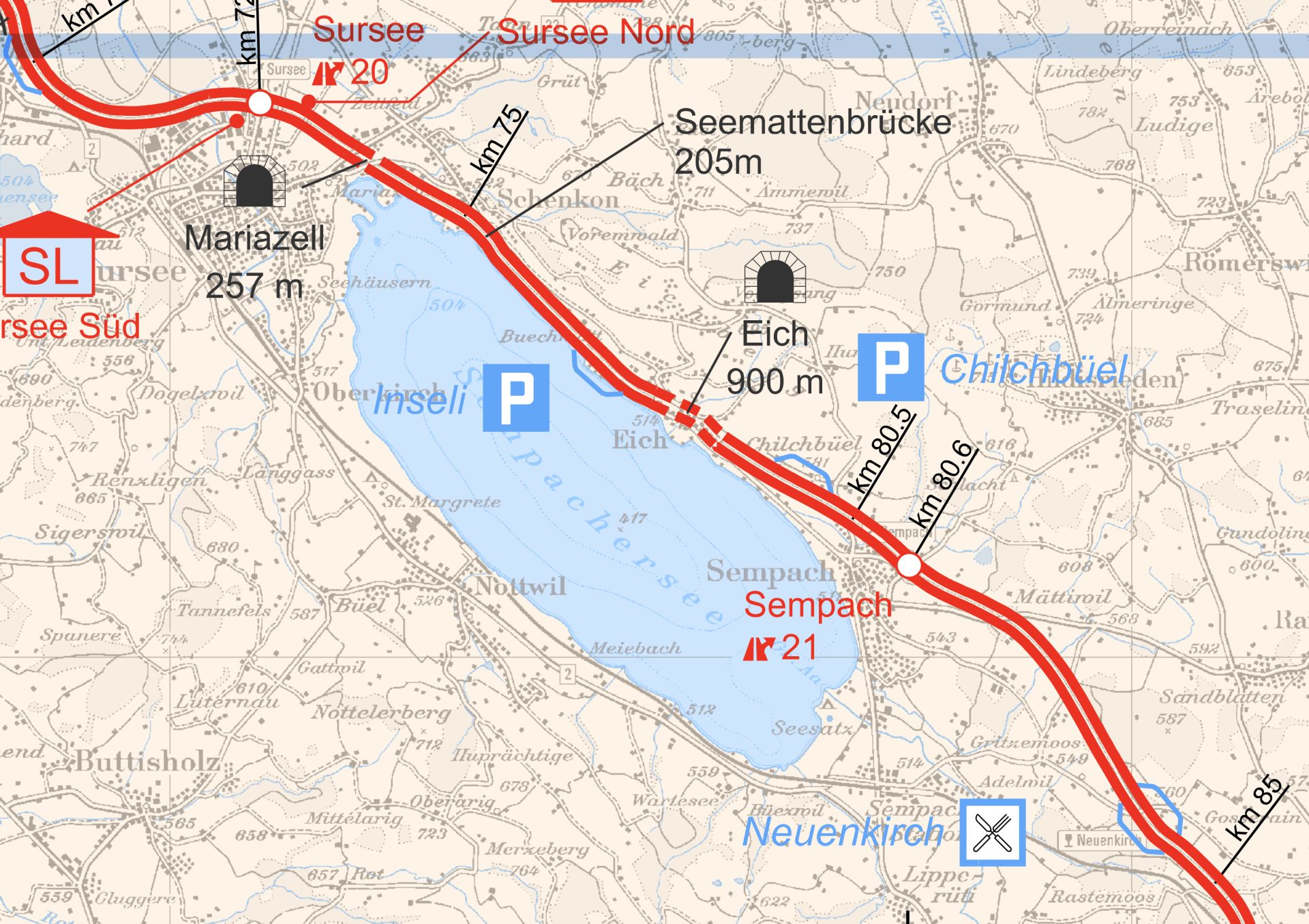 Für den Einbau der Beläge müssen am Wochenende von Freitag, 21. Juni, ab 20 Uhr bis Montag, 24. Juni, 5 Uhr., beim A2-Anschluss Sempach die Ein- und Ausfahrtsspuren in Fahrtrichtung Luzern gesperrt werden. Die Umleitungen sind signalisiert.