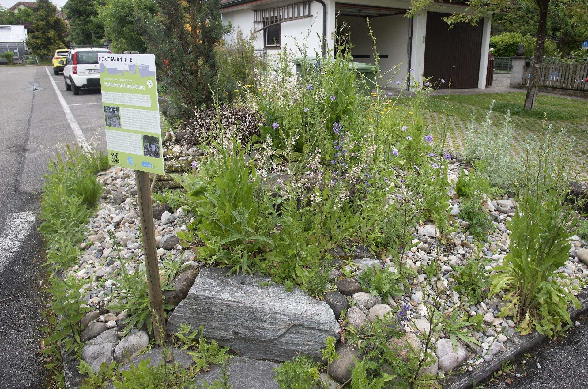 Jetzt geht es auf einem kleinen Weg Richtung Berufsbildungszentrum. Die Nummer 3 des Rundgangs beschreibt einen Steingarten, der einen ökologischen Mehrwert hat. Er sei voller Leben, steht auf dem Schild. «Der Garten wird schonend gepflegt, wenn etwas zu sehr wuchert, wird es von Hand ausgezupft oder zurückgestutzt.»