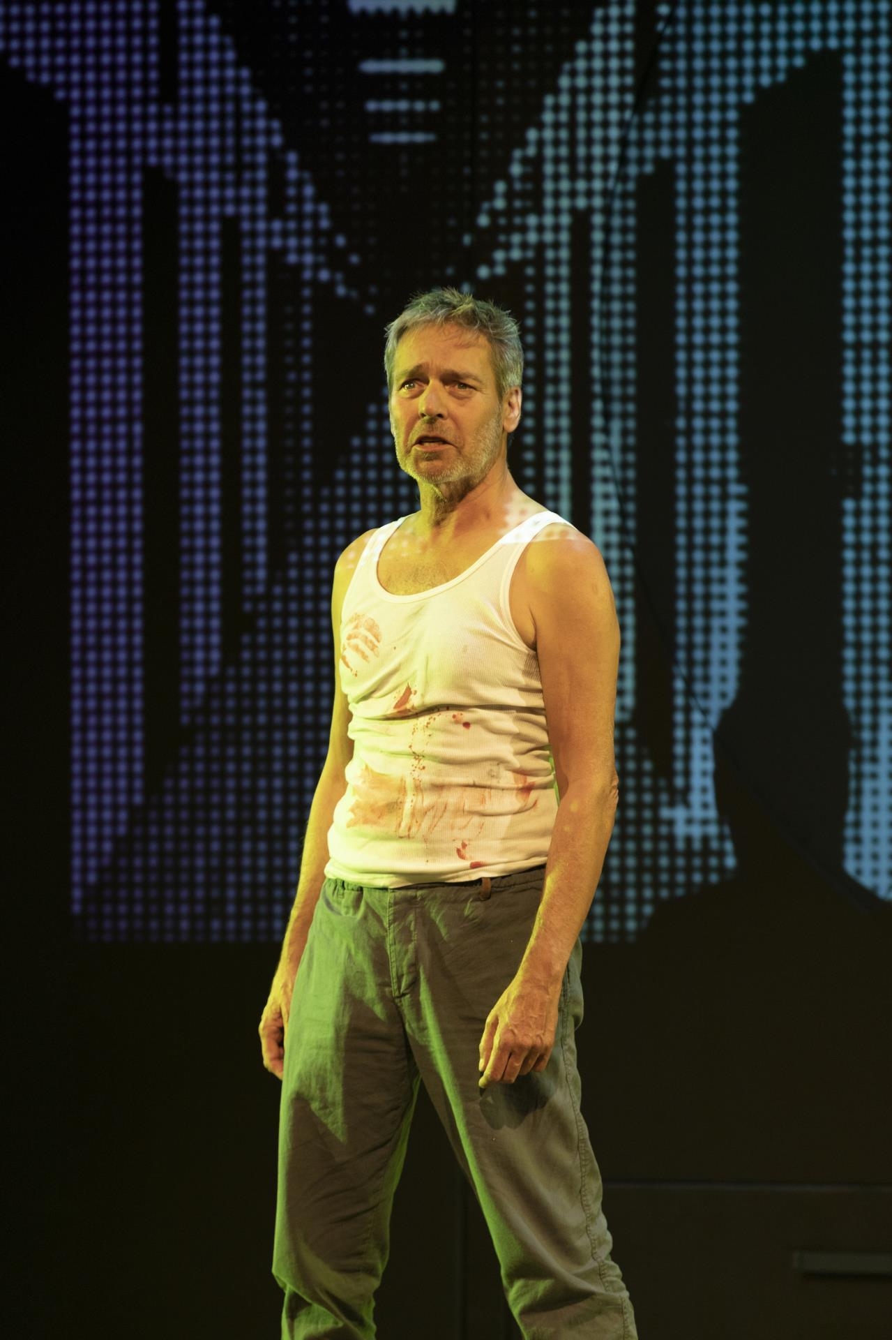 Viele Szenen waren sehr kurz, in den Pausen wurden Sekunden lange Musikstücke abgespielt, welche die beklemmende Stimmung unterstützten. Auf der grossen Leinwand wechselten Schwarz-Weiss-Fotografien von anonymen Menschen auf der Strasse, die eine düstere Szenerie projizierten. Auch Filmsequenzen im gleichen Ton waren zu sehen.