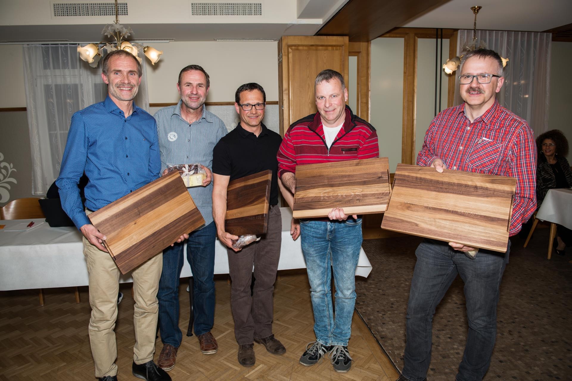 Etliche Mitglieder wurden vom Präsidenten für ein Firmenjubiläum geehrt und erhielten ein eingraviertes Holzbrett mit Fleisch und Käse für ein Zvieri. Für 30 Jahre Geschäftstätigkeit sind dies Arthur und Stefan Schürmann (Spenglerei Schürmann AG), Bruno Müller und Beat Zihlmann (Müller & Zihlmann AG) und Walter Roos (Roos Holzbau AG). Für 20 Jahre geehrt wurden Patrik Ziswiler (A6 architekten ag) und Hugo Lang (Hugo Lang GmbH).