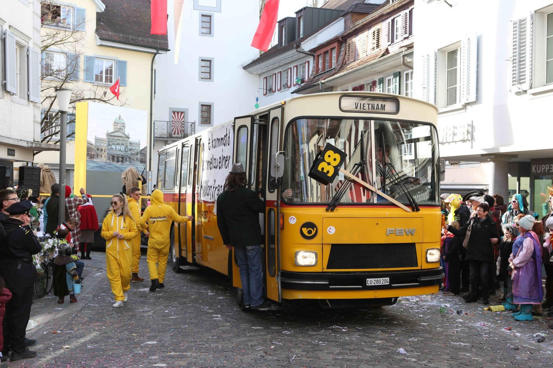 Lokales auf die Schippe nahmen die Mitmeister der Heinizunft, die den gescheiterten «Spannertorm zu Soorsi» zu Grabe trugen: «Luegsch du no, oder schpannsch du scho?» Zu den Highlights des heurigen Umzugs zählten der Wagen von Getomapi.ch, der das Weisse Haus zum Affenhaus – bewohnt von Trump und Kim – machte, und die Sujets zum Postauto-Skandal, die gleich zweifach und stilgerecht mit Bundeshaus und Dreiklanghorn auffuhren. Einerseits tat dies die Roggenzunft Schlierbach, die kalauerte: «Öisi Poscht bschiisst ond erschliicht 170 Millione – d'Frou Ruoff luegt zue ond hofft, mer tüeg alli verschone.» Und nach einer längeren Kunstpause, die einige Zaungäste vorzeitig das Weite suchen liess, kamen die Altheiniväter sogar in einem echten gelben Bus von «Prostauto Berner Oberland» mit Fahrzielanzeige «Vietnam» angefahren.