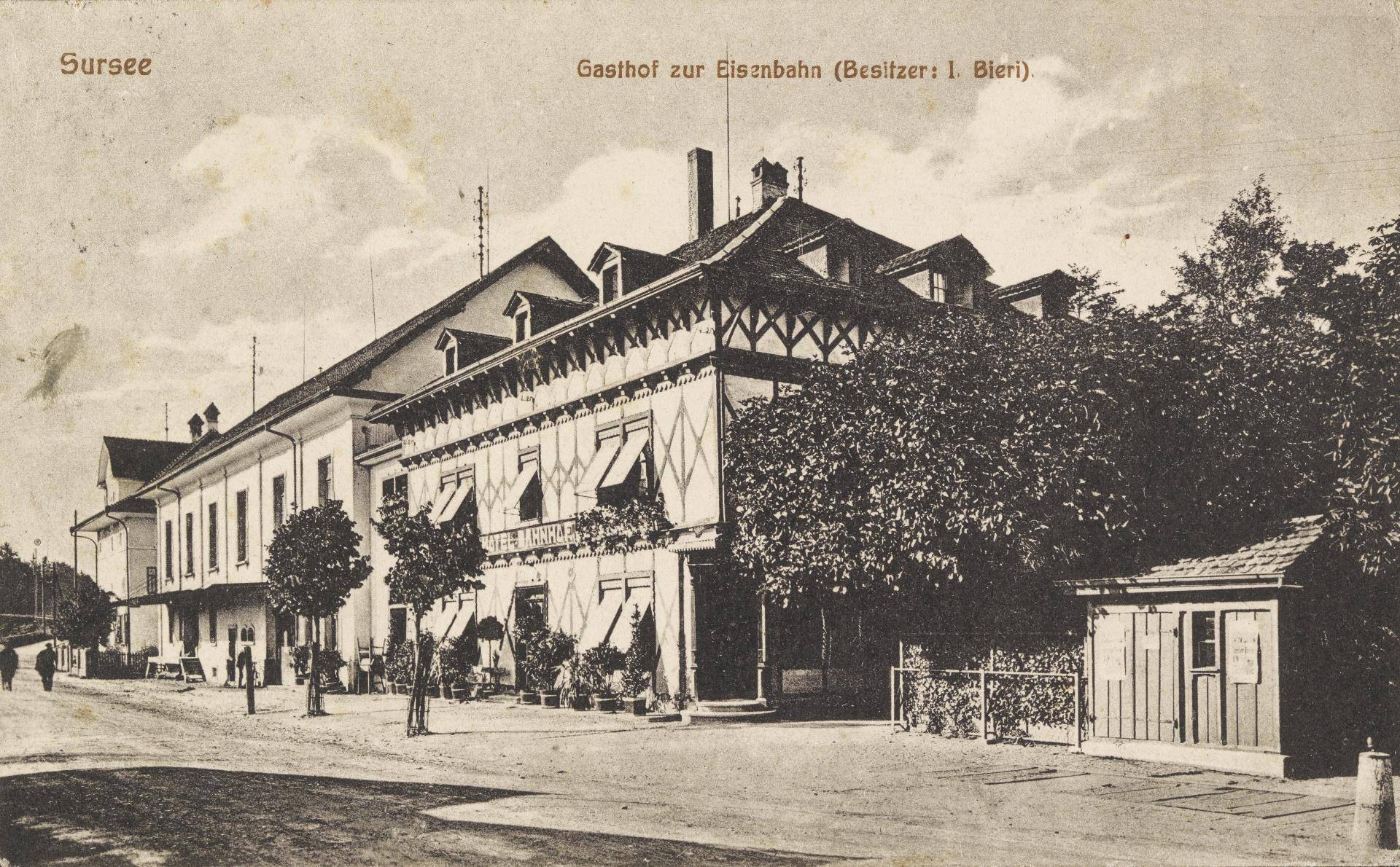 Das Gasthaus Eisenbahn hat Spuren bis zur Ankunft der Eisenbahn in Sursee 1856. Diese Postkarte stammt aus dem Jahr 1906. Das Gebäude wurde inzwischen abgerissen.