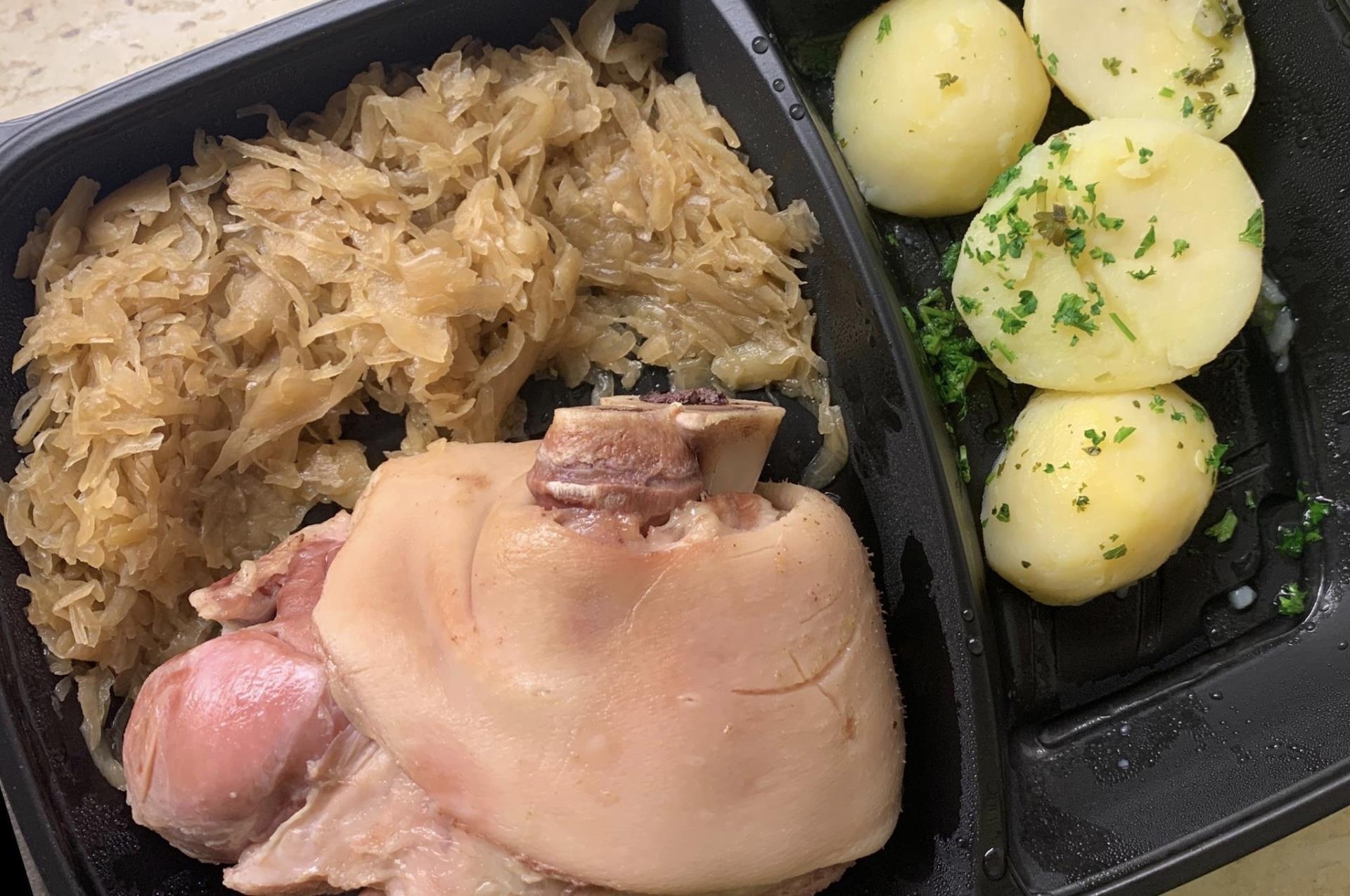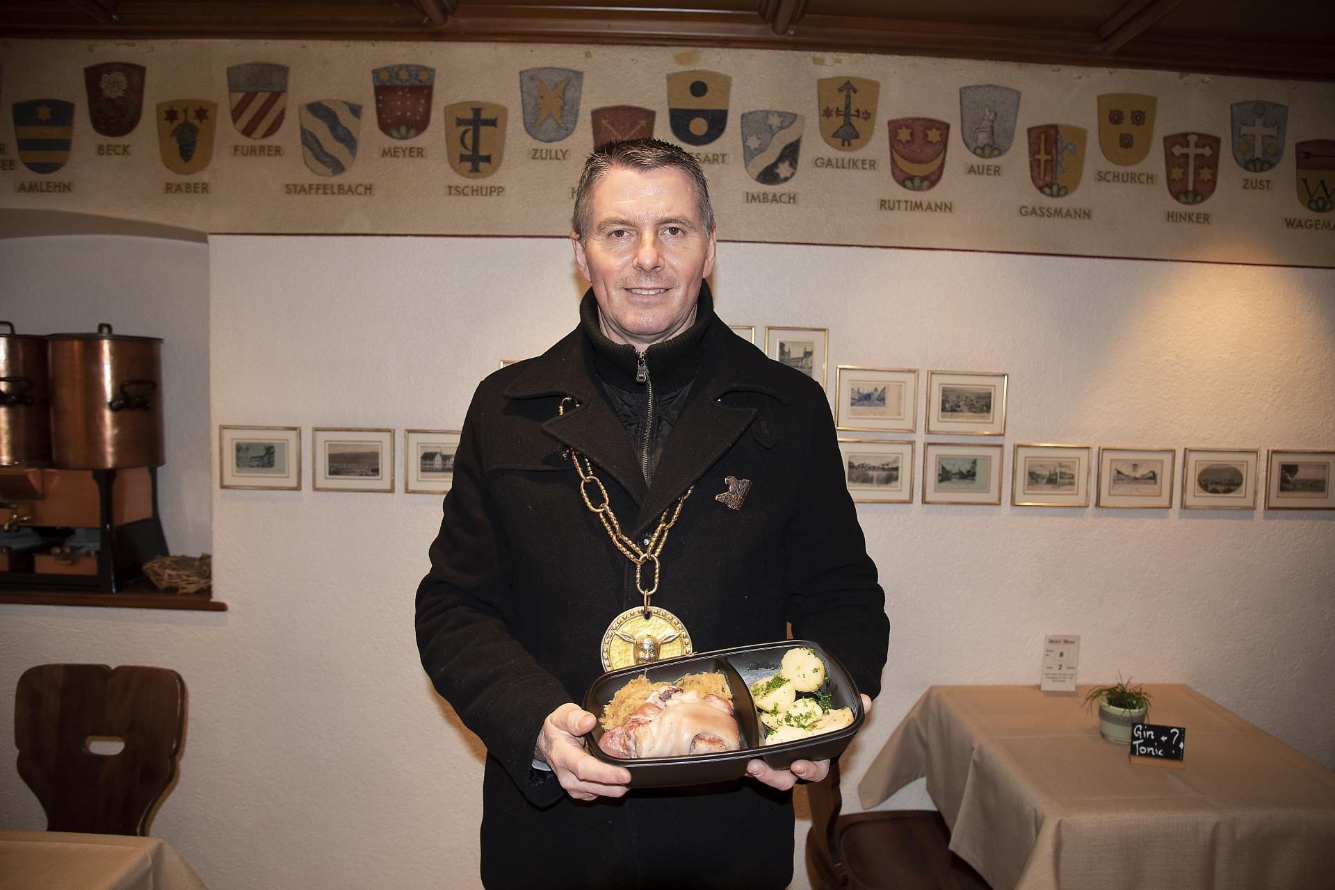 Rund 25 Bestellungen für die Delikatesse bekam Uschi Winiker. Die Wirtin des «Wilden Mann» in Sursee servierte die Gnagis am frühen Abend in einem Gebinde, das die Zünftigen dann nach Hause nehmen konnten. Im trauten Heim, nicht in geselliger Runde, genossen sie später das typische Schweizer Gericht mit Sauerkraut und Kartoffeln. Auch Heinivater Alois «Wisu» Amrein holte ein Gnagi ab, wie das Foto zeigt.