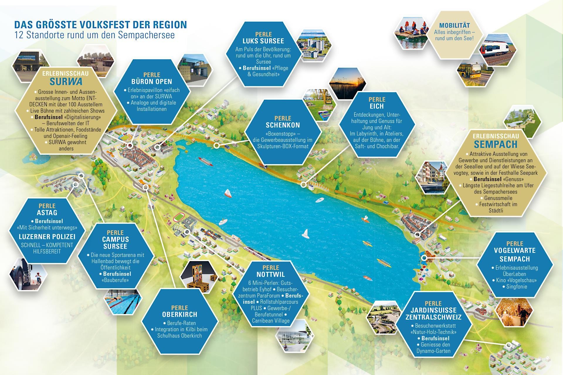 Die Lehrlinge der Region Sempachersee präsentieren an sieben Berufsinseln ihre Berufe und vermitteln auf spielerische Art ihren Berufsalltag. Ob als erfahrene Berufsfrau oder erfahrener Berufsmann, ob als Schülerin oder Schüler, die Berufsinseln bieten spannende Einblicke ins aktuelle oder zukünftige Berufsleben. Pro Standort werden jeweils zwischen fünf bis zehn verschiedene Berufe vorgestellt.