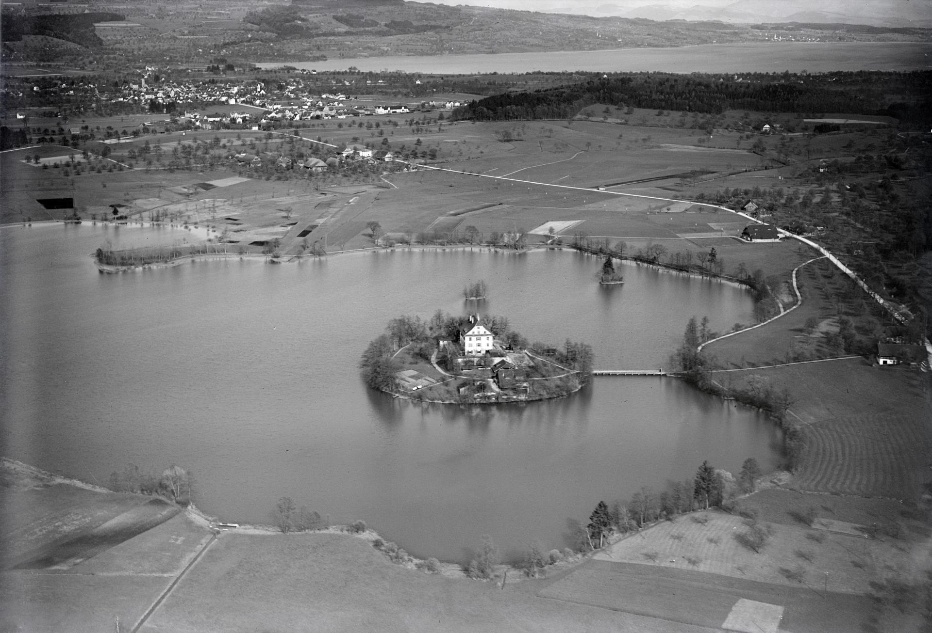Aus einer Höhe von 150 Metern: das Schloss Mauensee mit Blick auf Sursee und den Sempachersee. Das Foto entstand durch Walter Mittelholzer auf einem seiner Flüge.