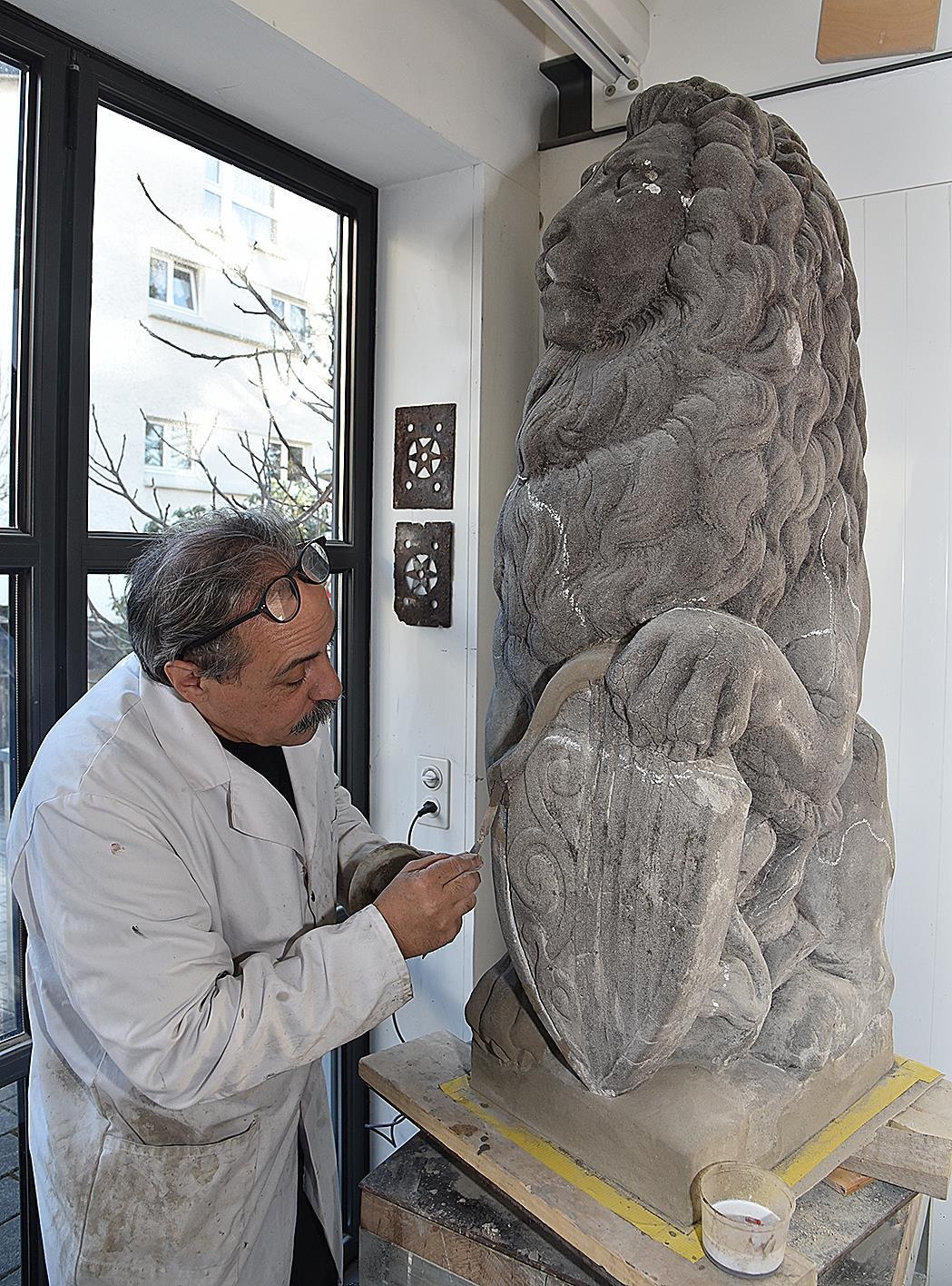 Der steinerne Löwe, der seit Jahrzehnten vor dem Rathaus den Schild hält, ist bei Bildhauer Vitus Wey in der Kur. Die Statue ist nicht nur vom Alter…