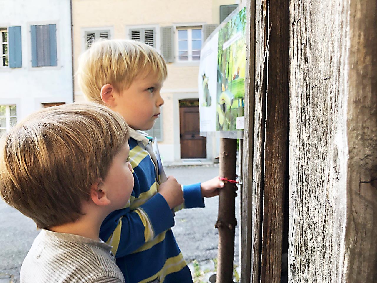 Die Schatztruhe ist der grosse Renner des Parcours, der bei der Regionalbibliothek Sursee beginnt und über zehn Stationen bis zur Klosterkirche und zurückführt. Er ist vor allem für Familien geeignet. Vor allem für Kinder, die sich gerne Geschichten vorlesen lassen. Und welches Kind liebt dies schon nicht. Dies bestätigten auch die beiden Jungs auf dem Foto, Charly und Fred.