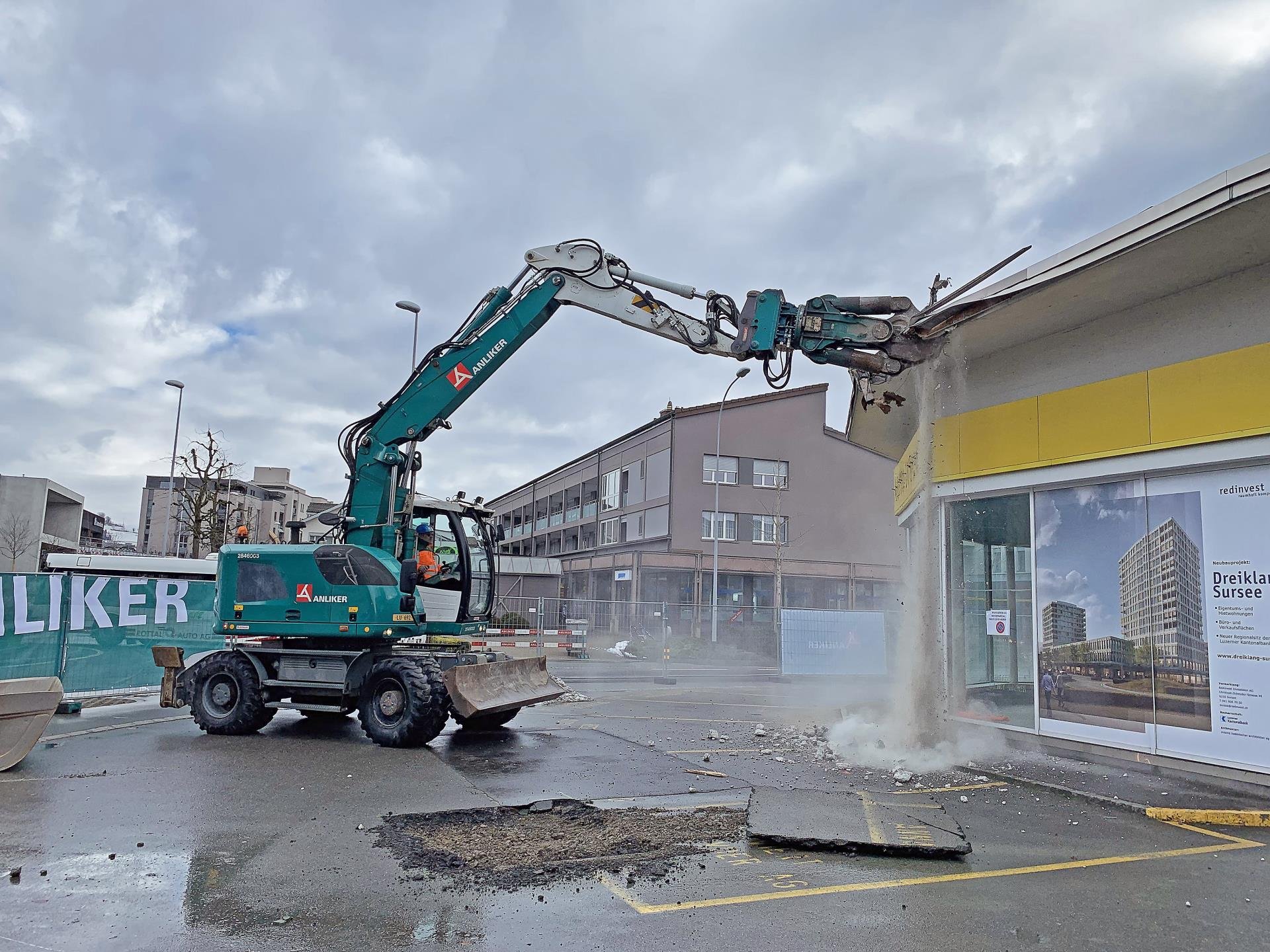 Eisern blitzen die Reisszähne. Der grüne Mini-Koloss setzt sich in Bewegung. Ächzt, hebt träge seinen Einarm, beisst sich fest. Beton, Blech und Eisen zerbersten unter dem Druck der Greifzangen. Zentimeter für Zentimeter frisst er sich ins Dach der alten Auto-Wyder-Garage. Bauschutt rieselt zu Boden. Die Anliker-Maschine lässt ihren Greifer sinken, das Horn ertönt. Auf dem abgesperrten Gelände applaudiert die Menschentraube.