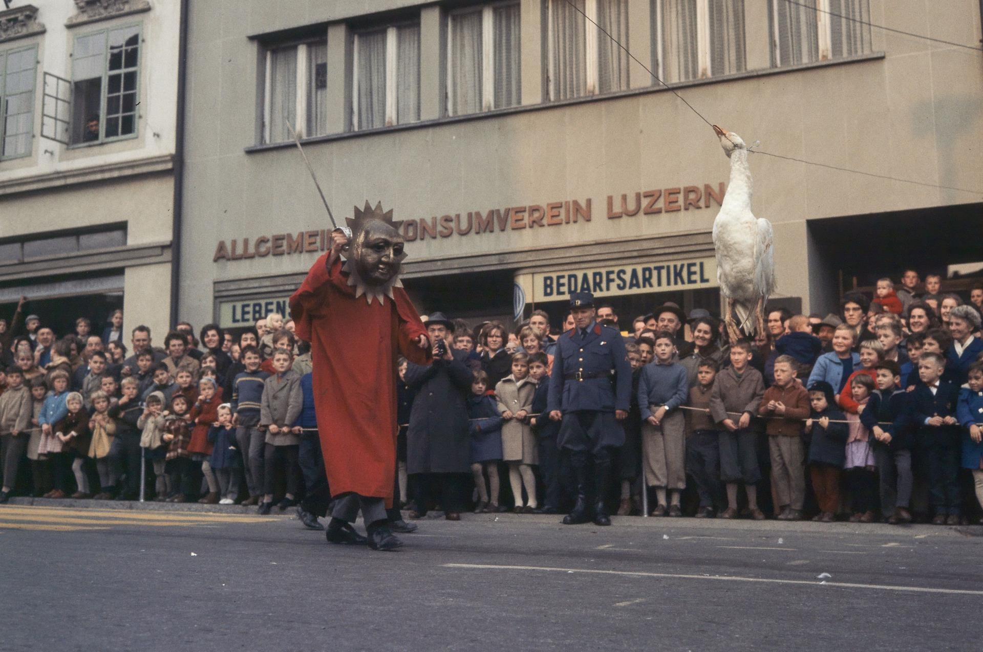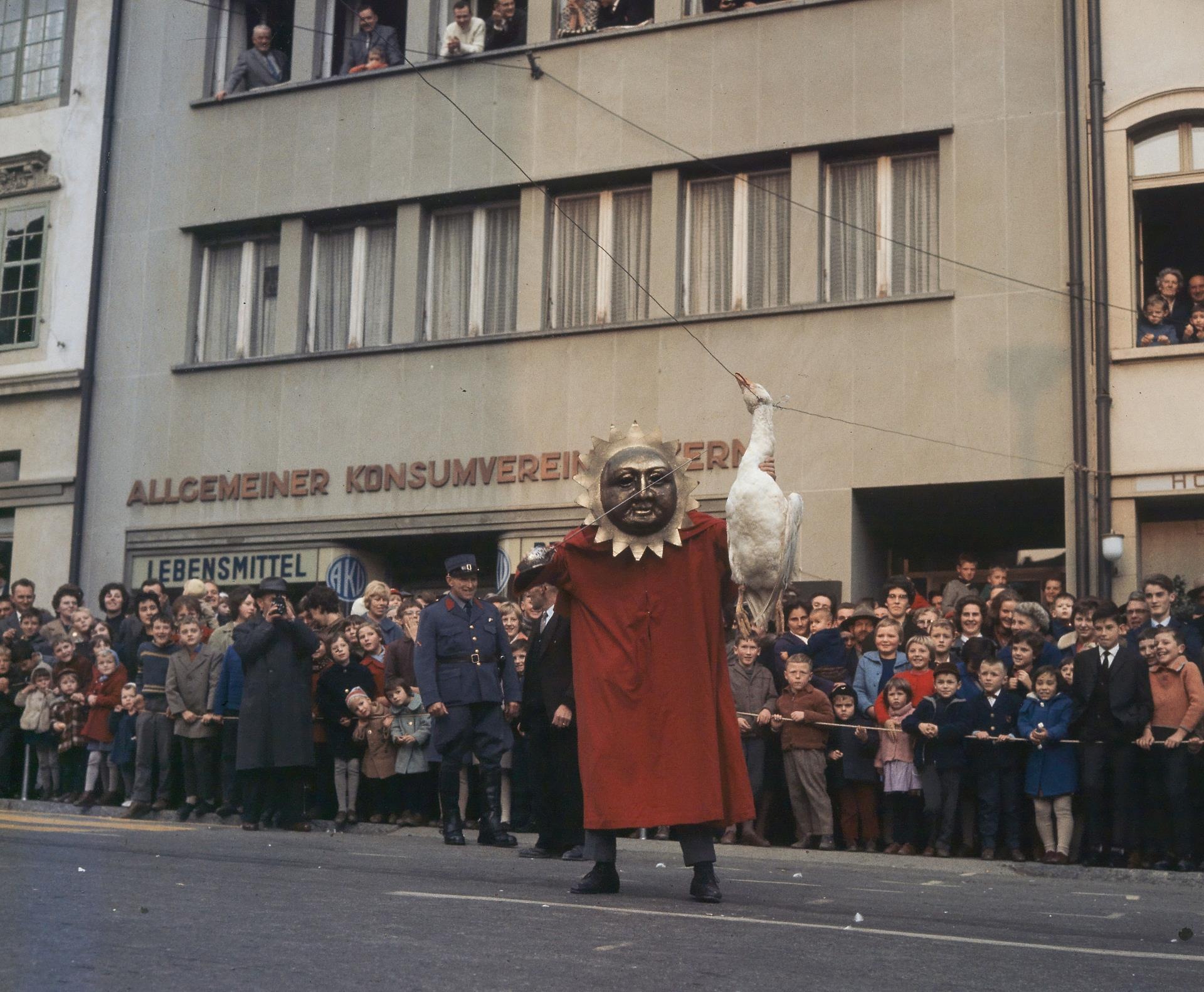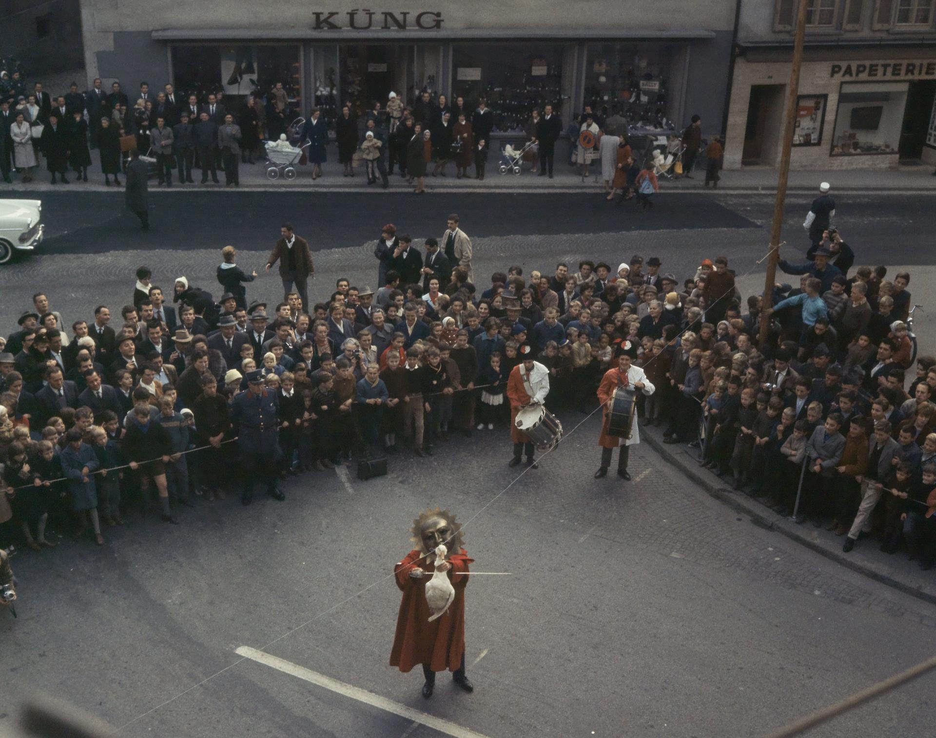 Vor 57 Jahren brauchte der Gansabhauet noch keine Bühne. Die Schläger hatten viel Platz. Mit dabei waren bereits die Trommler. Welche blaue Uniform ist links (oder auf dem anderen Foto rechts) des Schlägers zu sehen?