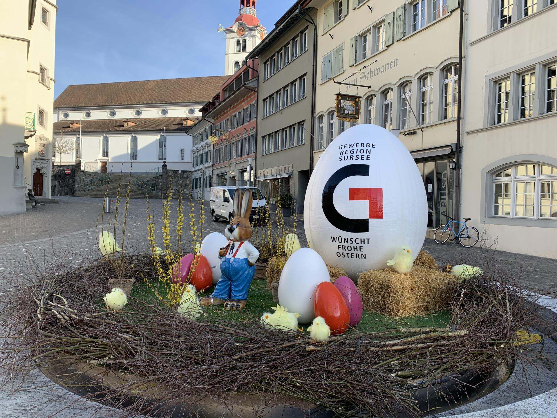Zehn Tage vor Ostern besucht der Osterhase das Städtli Sursee. Im Brunnen vor dem Rathaus fand er ein neues Nest.