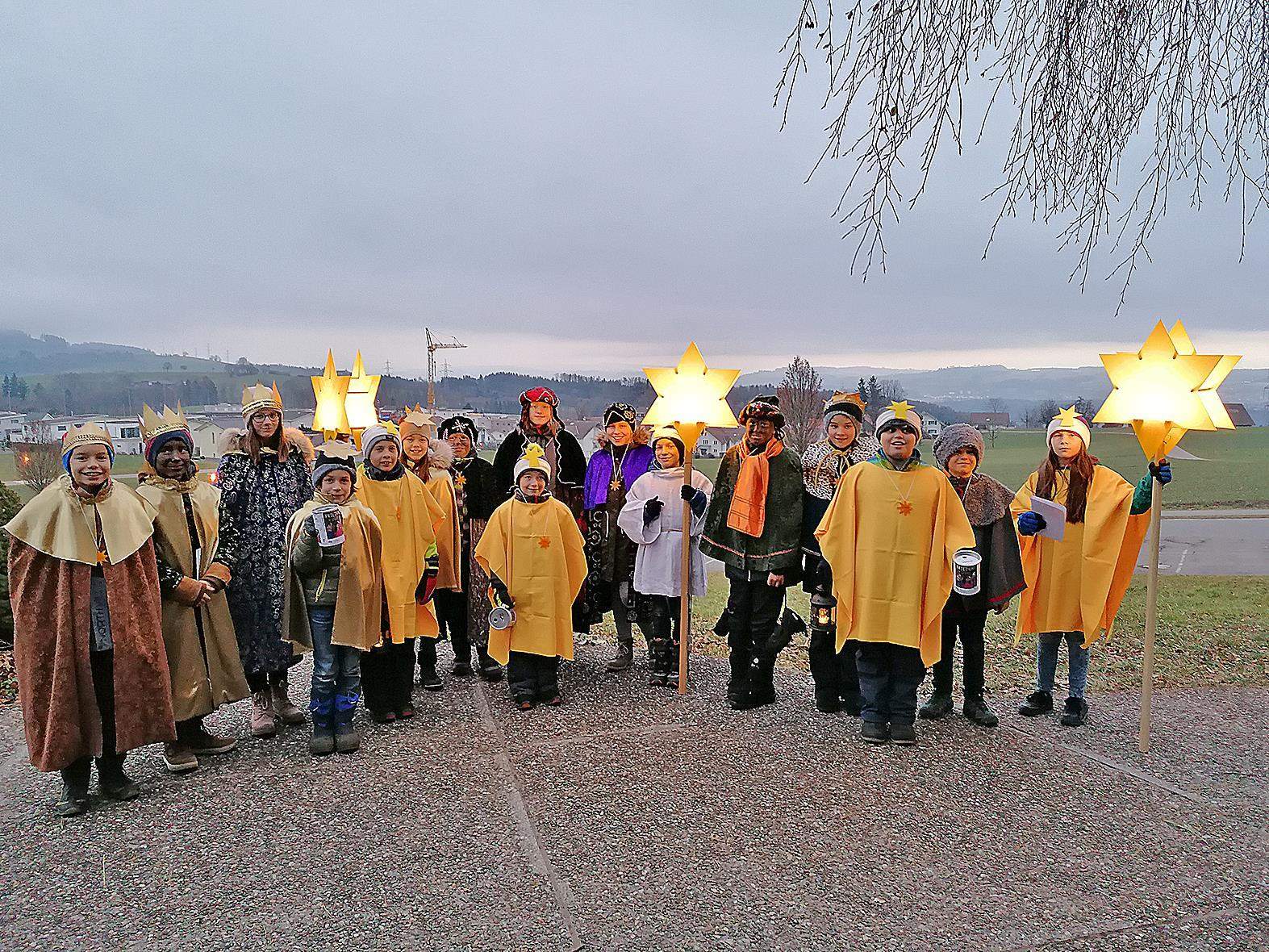 Mit jeweils drei Gruppen zogen die Sternsinger in der Gestalt der heiligen drei Könige samt Gefolge von Haus zu Haus. Sie verkündeten mit ihren Segenssprüchen die frohe Botschaft, sangen Lieder und schrieben mit den gesegneten Kreiden den traditionellen Schriftzug «20*C+M+B+20» (übersetzt «Christus segne dieses Haus») über die Haustüren oder verteilten einen Türaufkleber.