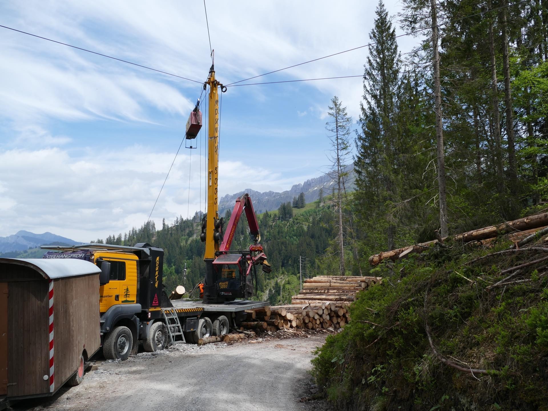 Die regionalen Waldorganisationen und Forstbetriebe setzen die Arbeiten in Zusammenarbeit mit spezialisierten Forstunternehmen für den Seilkran-Einsatz im steilen Gelände und für Entrindungsarbeiten um.