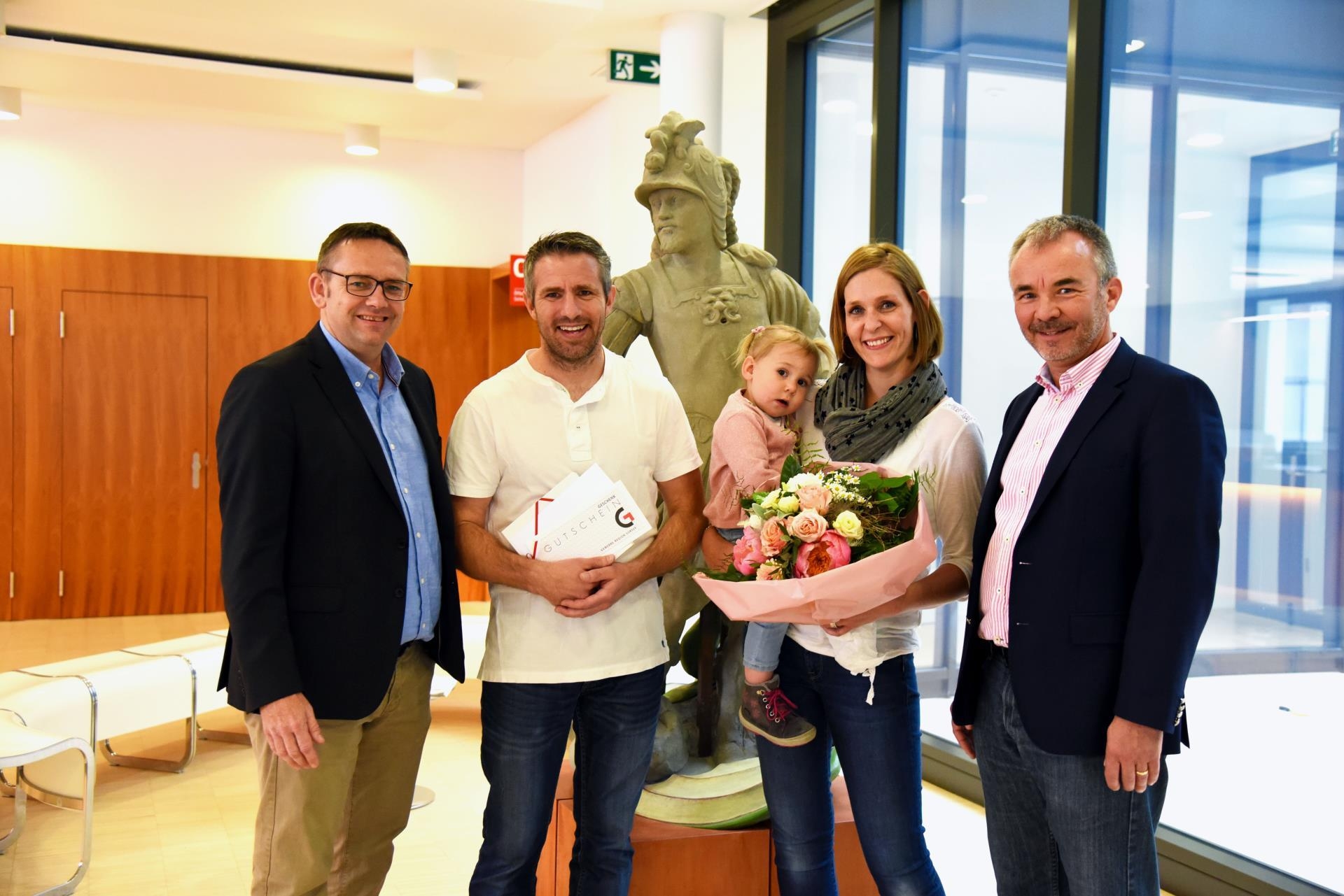 Sursee hat seine 10'000. Einwohnerin. Es ist die kleine Ziva Graf. Zusammen mit ihren Eltern Philipp Graf und Marjolein Thiele zog sie vor zwei Wochen nach Sursee ins Hofstetterfeld. Am Montagnachmittag empfingen Stadtpräsident Beat Leu und Stadtschreiber Bruno Peter die junge Familie auf der Stadtverwaltung. «Mit dem Timing des 10'000. Einwohners ist das so eine Sache», meinte Beat Leu schmunzelnd. Eigentlich sei man bereits vor anderthalb Jahren davon ausgegangen, dass man bald die 10’000er-Grenze knacken werde. Dass es jetzt endlich so weit sei, freue ihn besonders. Im Namen der Stadt überreichte Stapi Leu Blumen, GRS-Gutscheine – und eine Surseer Honiggans.