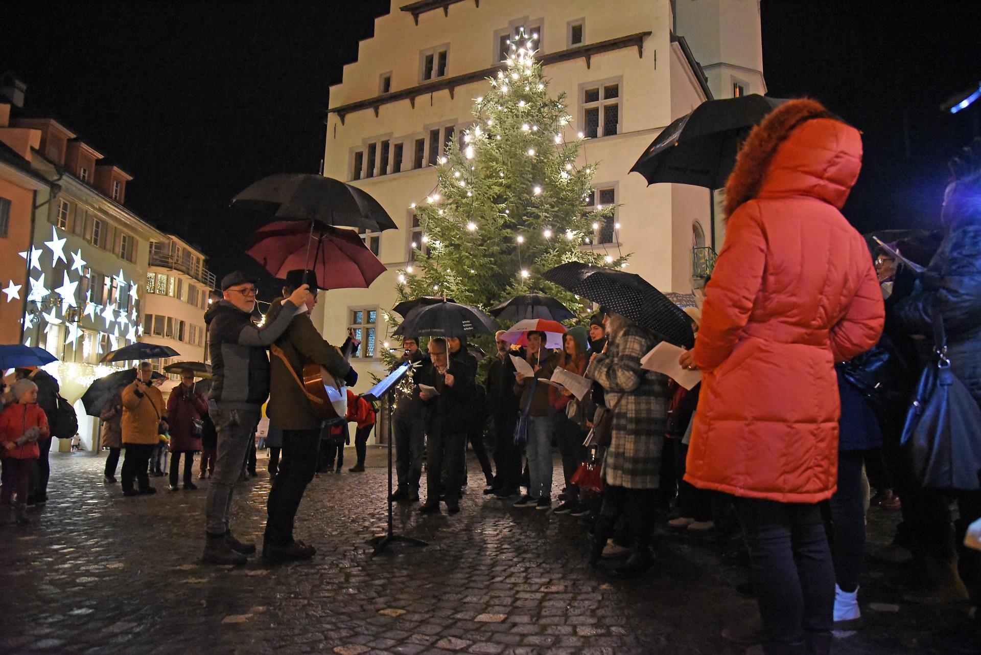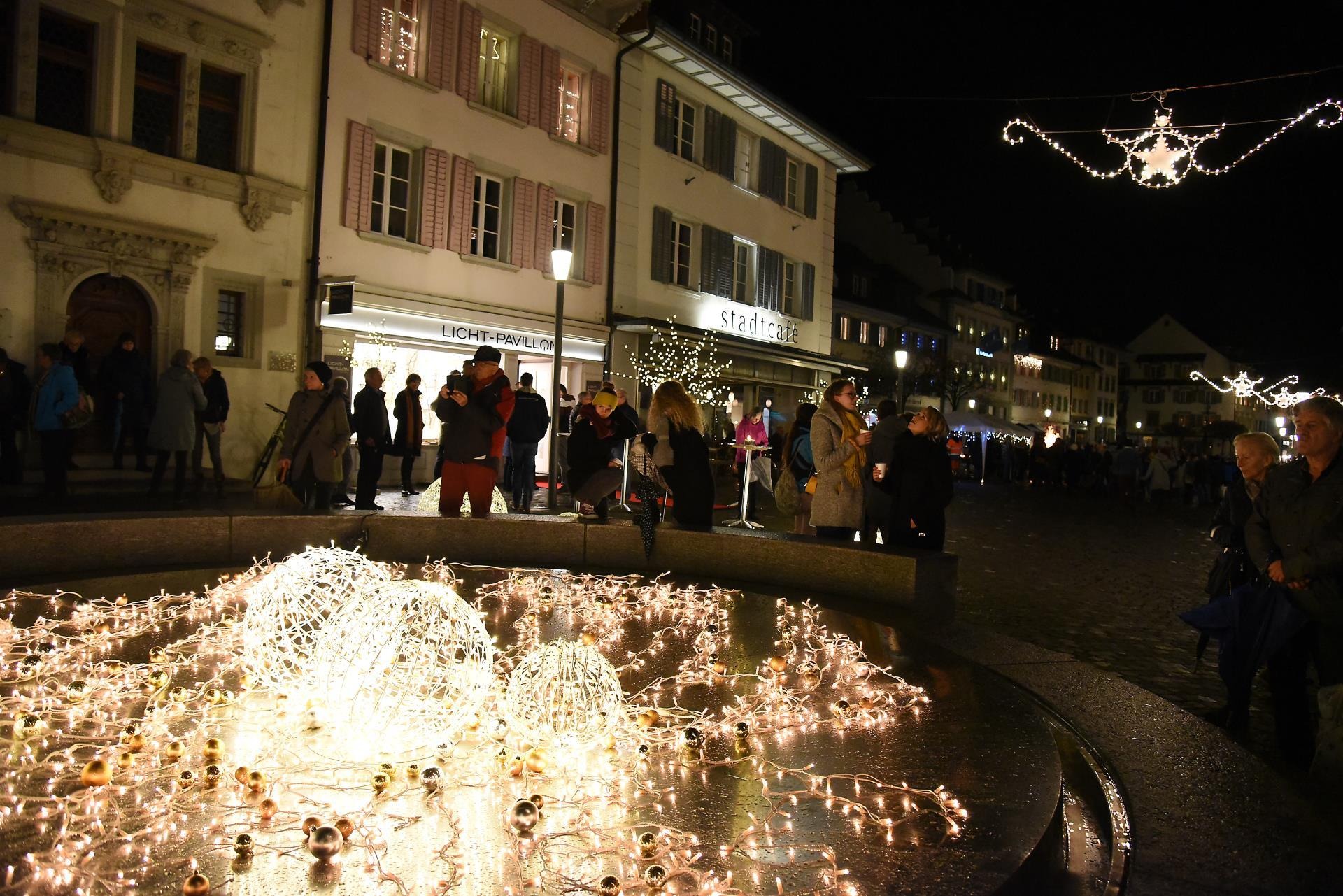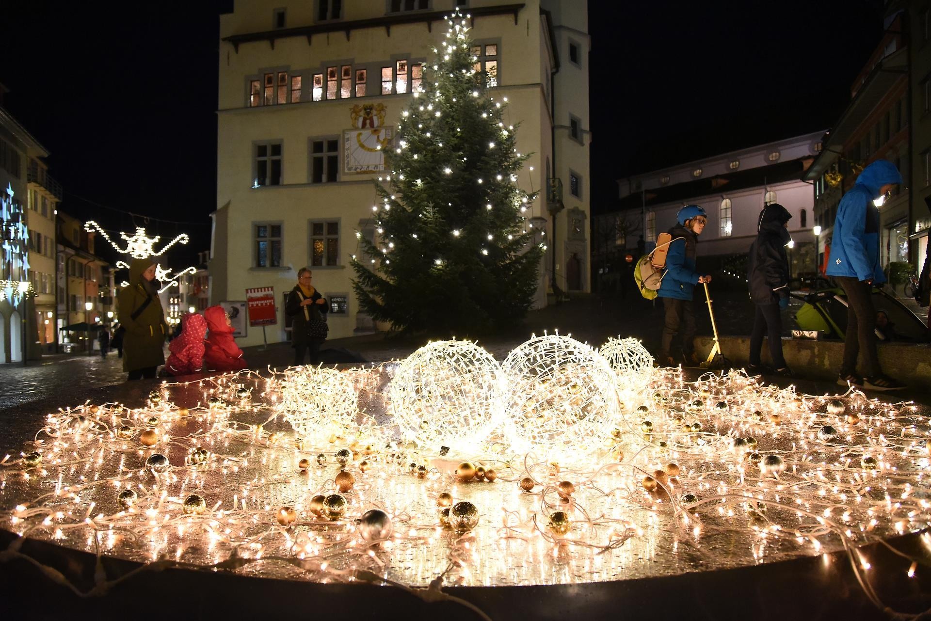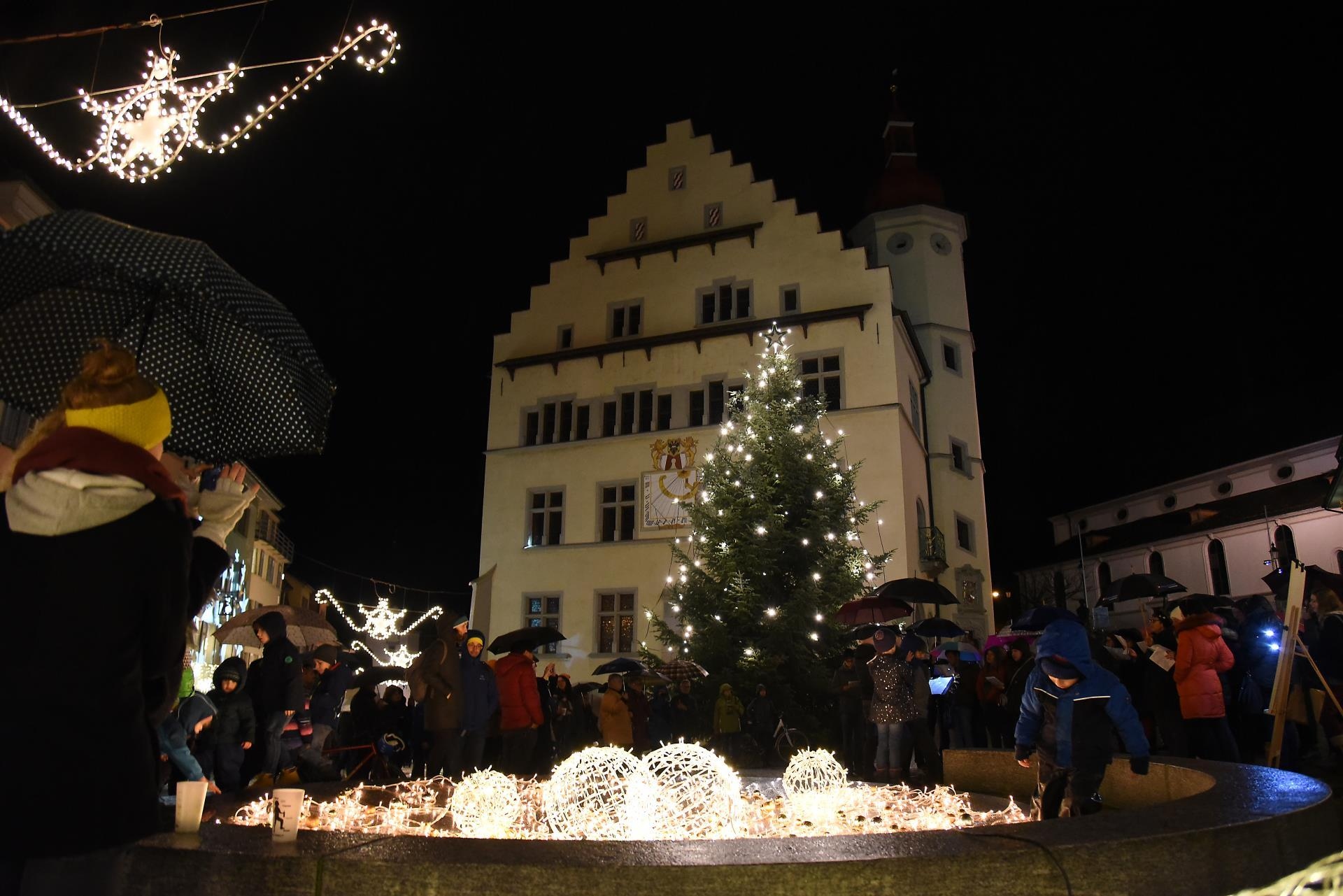 Magisch ziehen die Lichter im Brunnen vor dem Rathaus und dem Christbaum an. Bild: Foto Thomas Stillhart