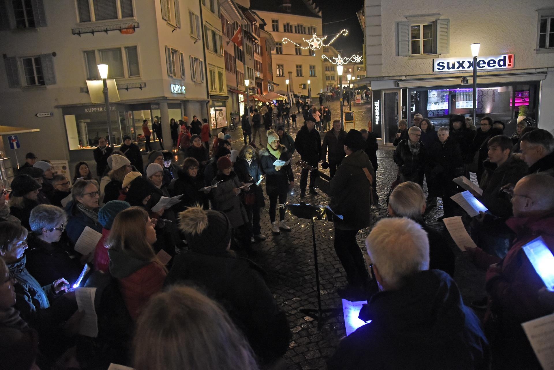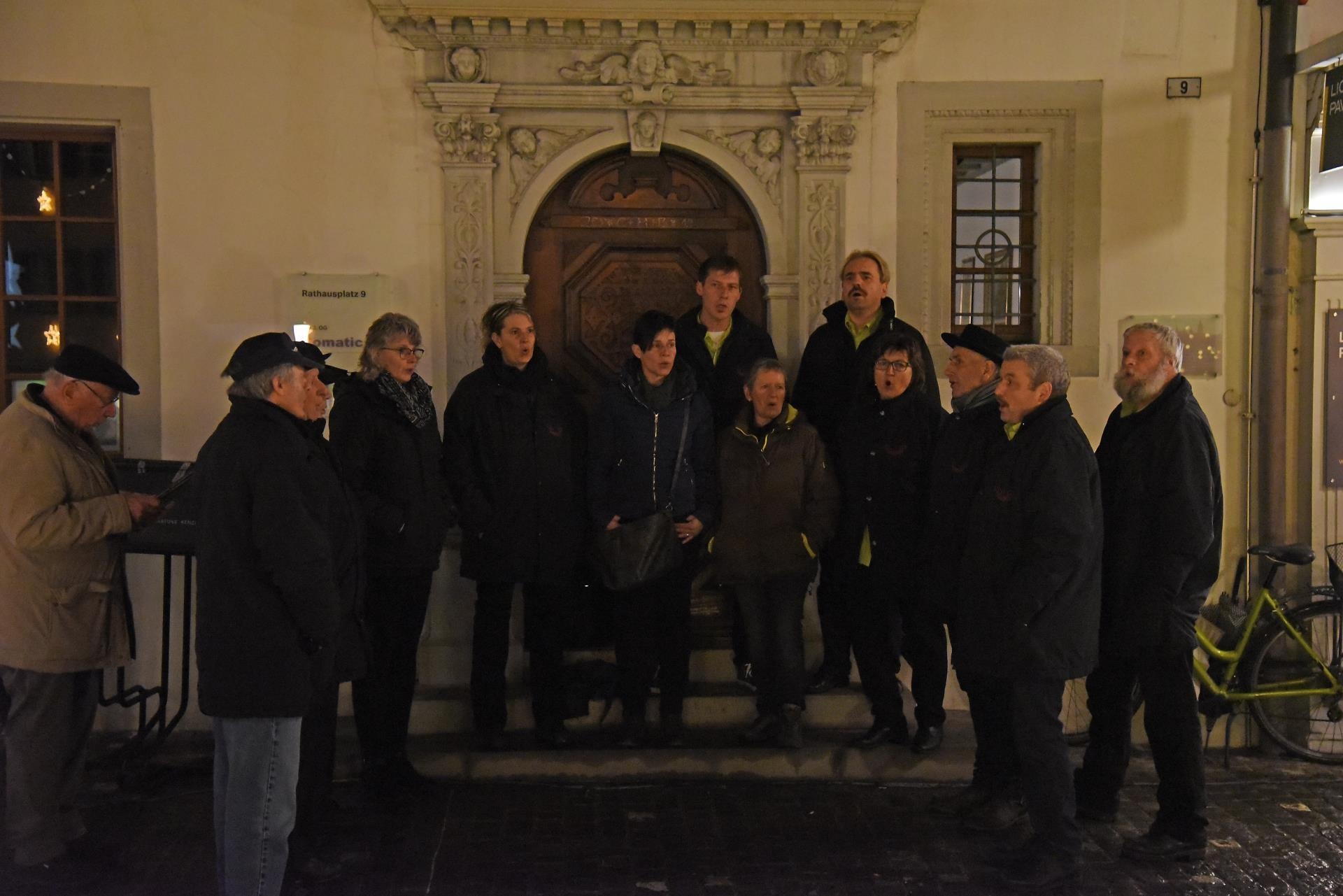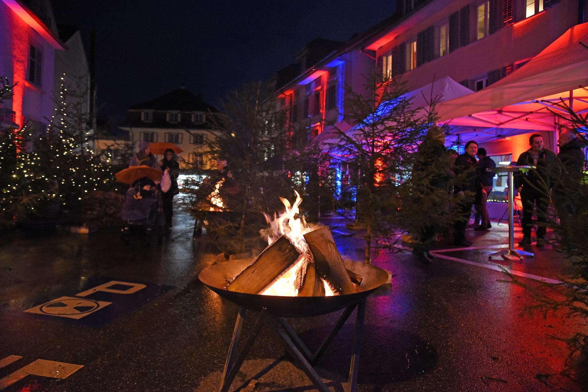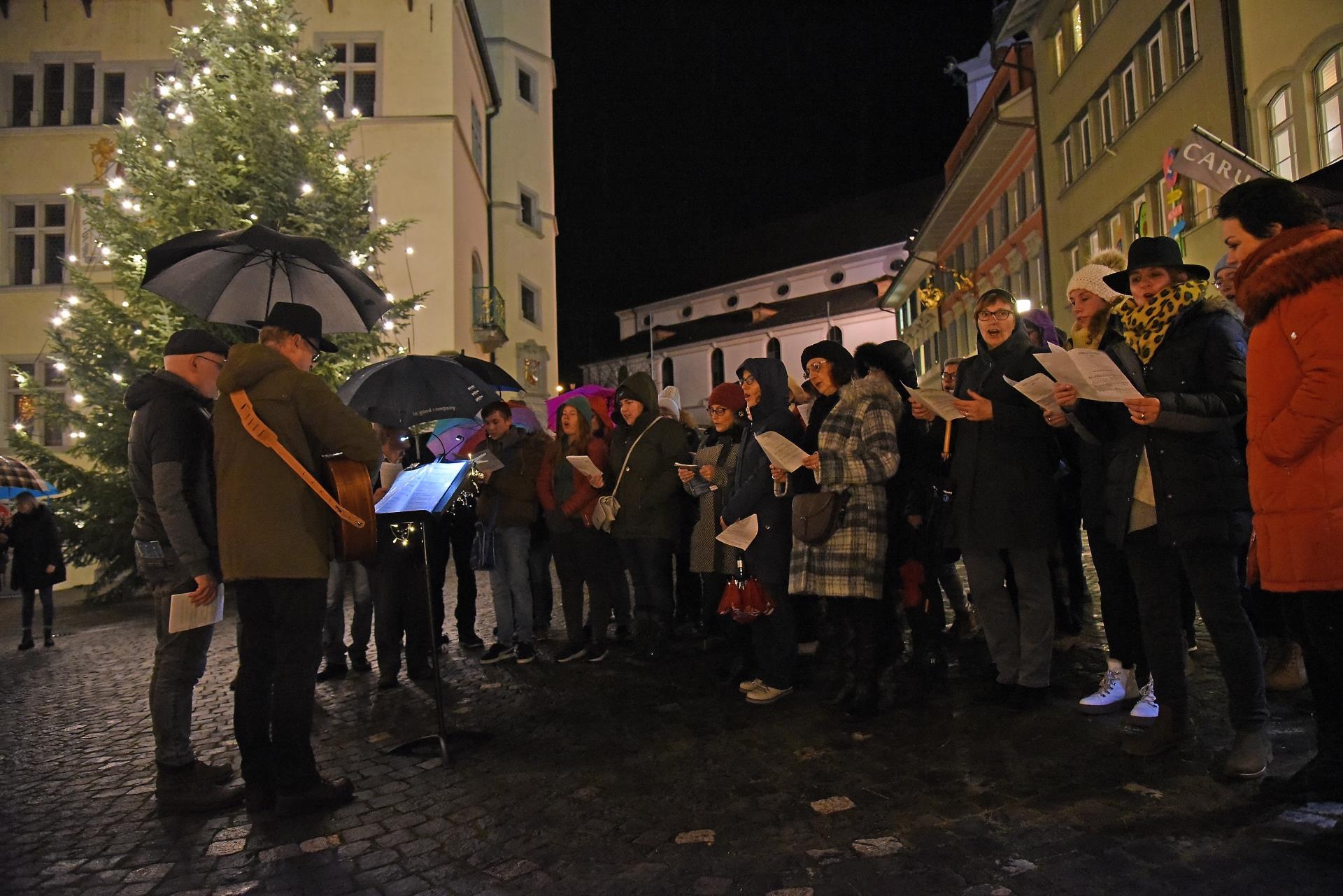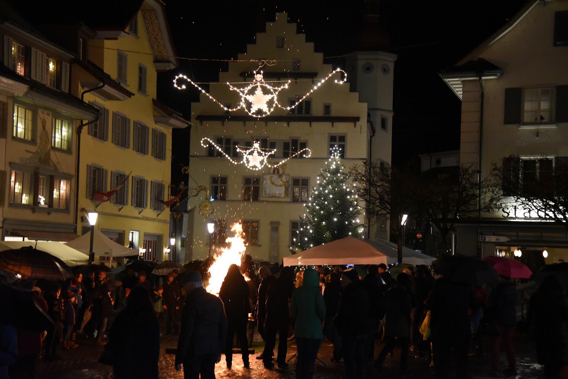 Magisch ziehen die Lichter im Brunnen vor dem Rathaus und dem Christbaum an. Bild: Foto Thomas Stillhart