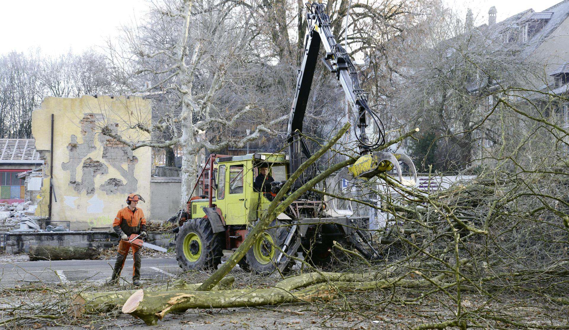 Kaum erhellten die ersten Sonnenstrahlen die Baustelle am Vierherrenplatz fuhren Baumfäller aus Neuenkirch mit schweren Forstmaschinen auf und bald fiel ein Baum nach dem andern. Nach ca. drei Stunden lagen die stolzen Laubbäume am Boden und wurden zersägt und gestapelt.