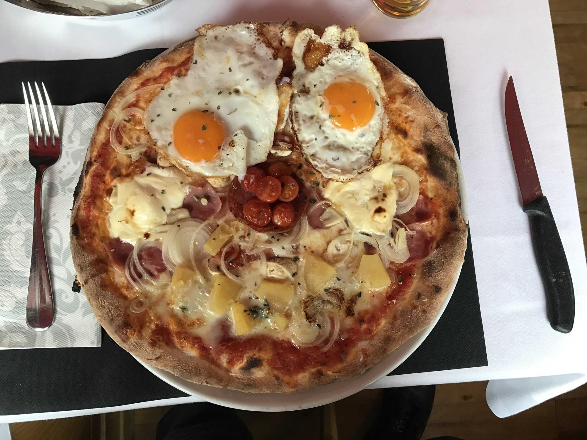 Heinivater Oli Schnieper hat mit Heinimamme Ursi und den beiden Heinigoofen traditionellerweise eine Pizza im Restaurant Schweizerheim kreiert. Die künstlerische Ader des Heinivaters, er arbeitet als Goldschmid, ist bei der Pizza offensichtlich. Mottogetreu lächelt ein Gloon den Pizzaesser an. Die Spiegeleier sind die Augen, Ananas der Mund.