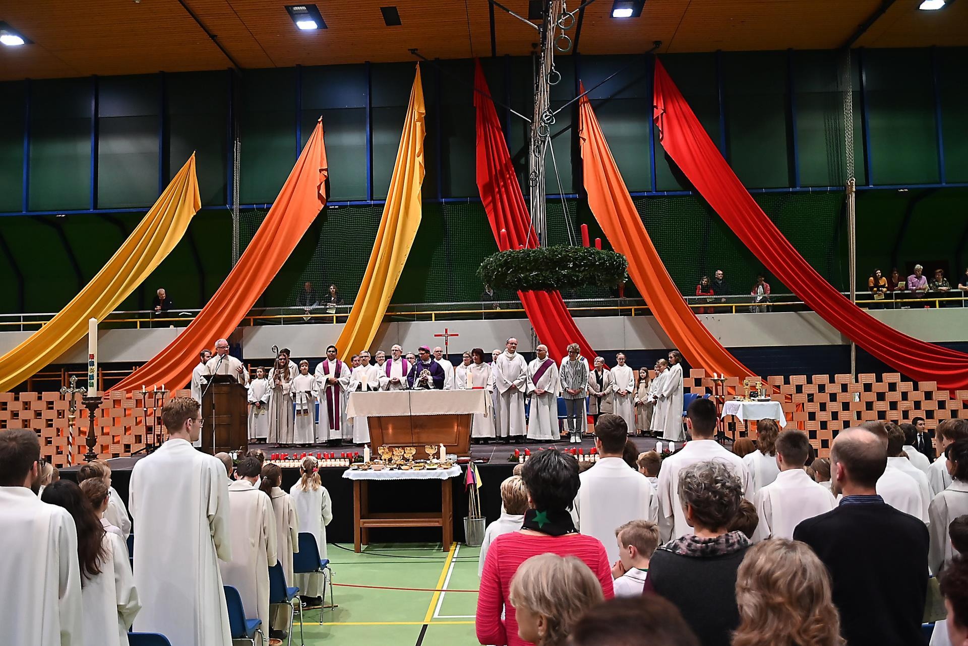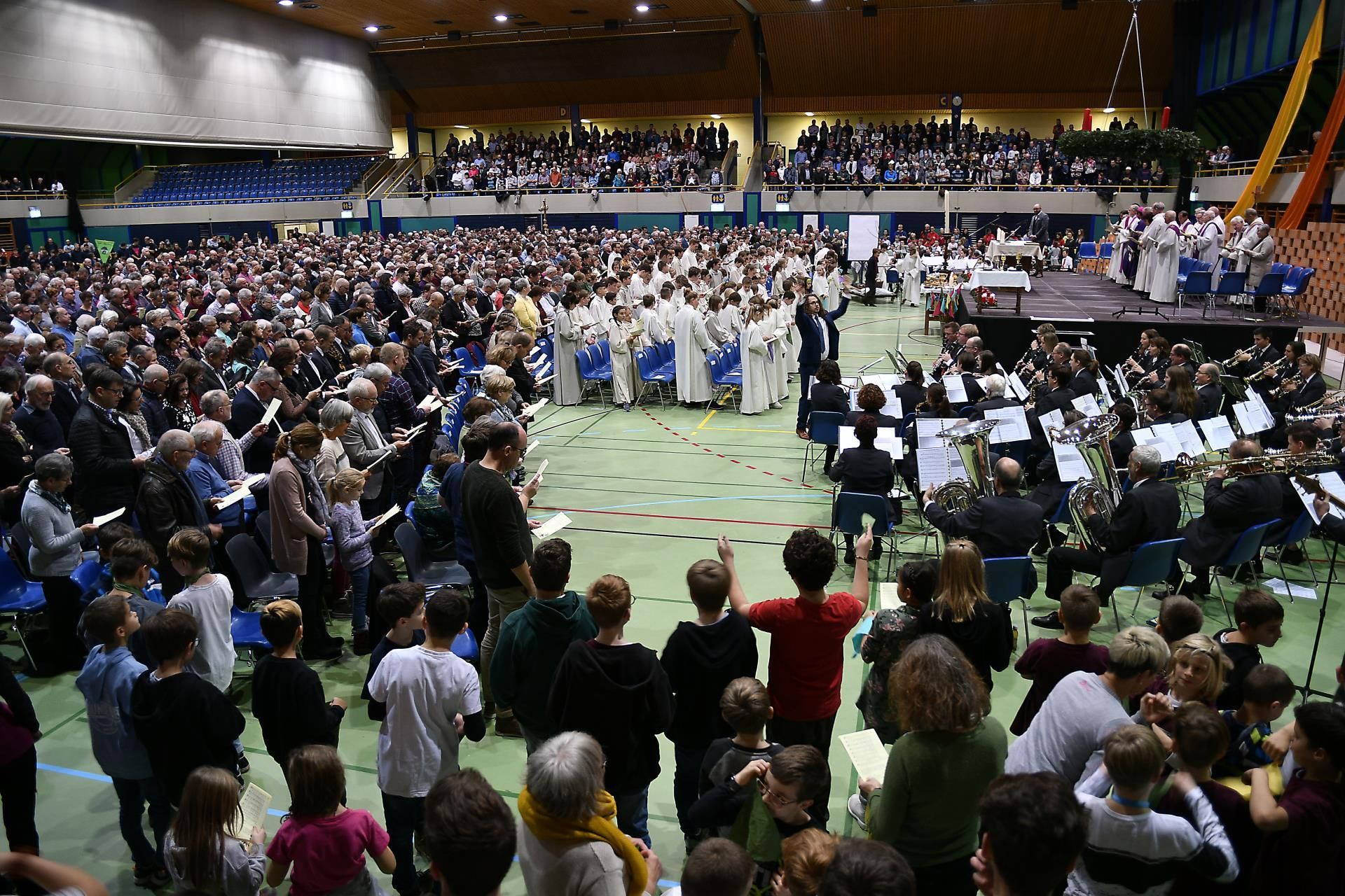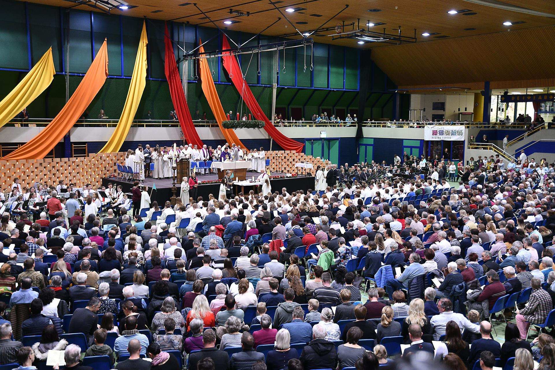 Sie strömten aus allen Nachbargemeinden und aus Sursee in die Stadthalle. Manche der über 2000 Christen fanden keinen Sitzplatz und standen während der 90-minütigen Errichtungsfeier auf der Tribüne. Einige Jugendliche sassen kurzerhand auf den Boden. Sie alle harrten dennoch aus und wurden mit einem jugendlich geprägten Gottesdienst belohnt.