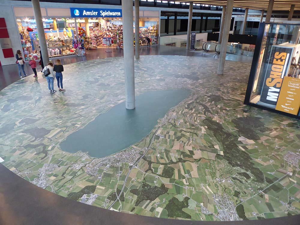 Im Einkaufscenter Surseepark können Besucher die Region Sursee aus der Vogelperspektive entdecken: Eine riesige Luftbildaufnahme von den umliegenden Orten ziert den Boden im 2. OG im Surseepark I.