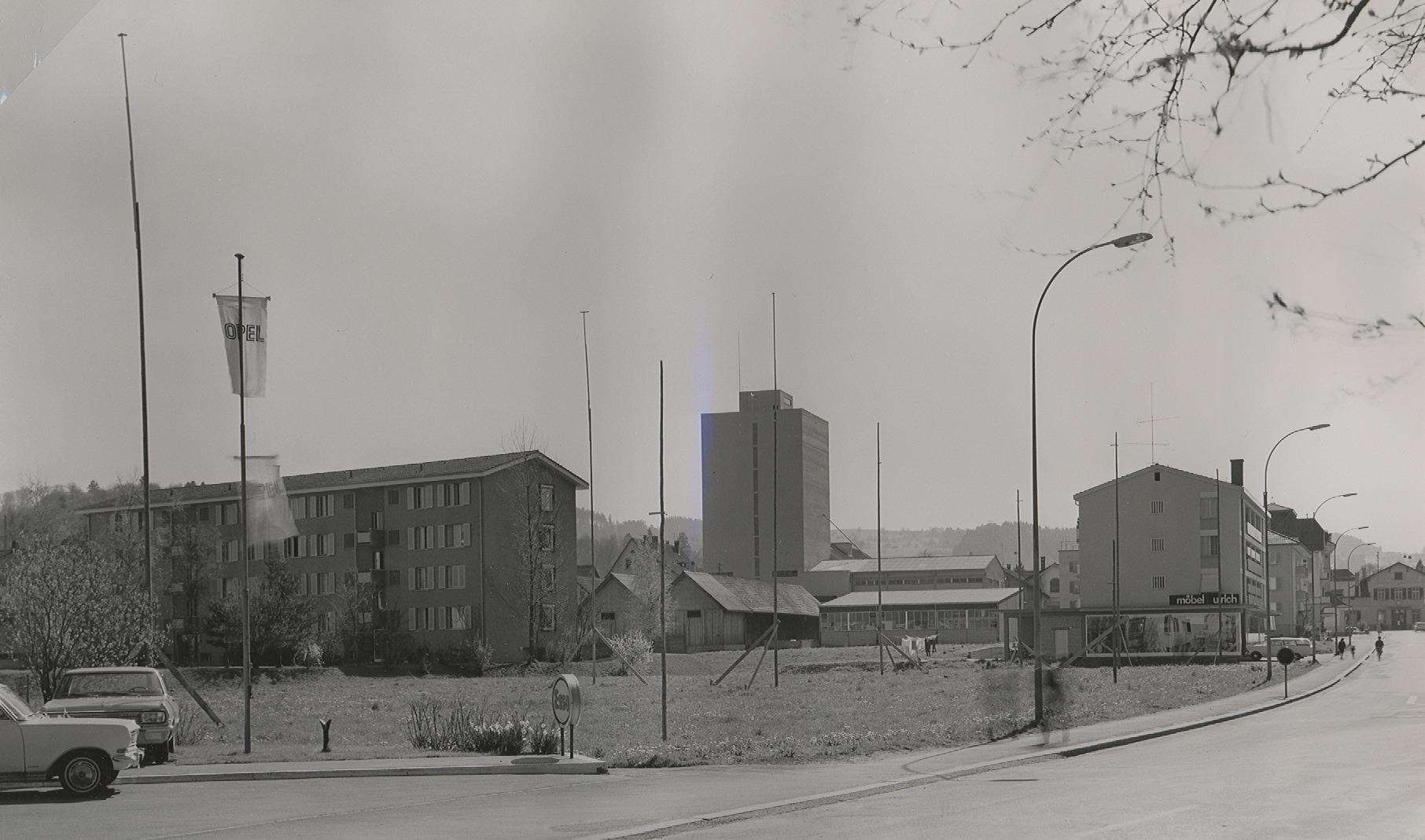 An der Bahnhofstrasse in Sursee entstand im Juni 1966 die Überbauung Schnydermatte. Auf dem Bild ist links die Einfahrt zur Garage Wyder zu sehen. Ganz am rechten Rand taucht der Bahnhof Sursee auf.