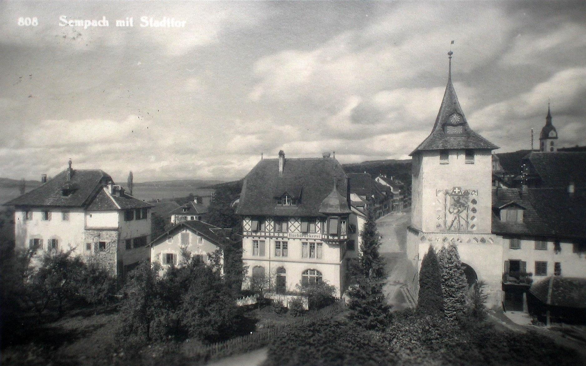 Auch vom anderen Ende des Sempachersees gibt es Bilddokumente von besonderem nostalgischem Wert. Hier eine Postkarte mit Stempel vom 7. April 1928. Darauf zu sehen ist unter anderem das Stadttor Sempach.