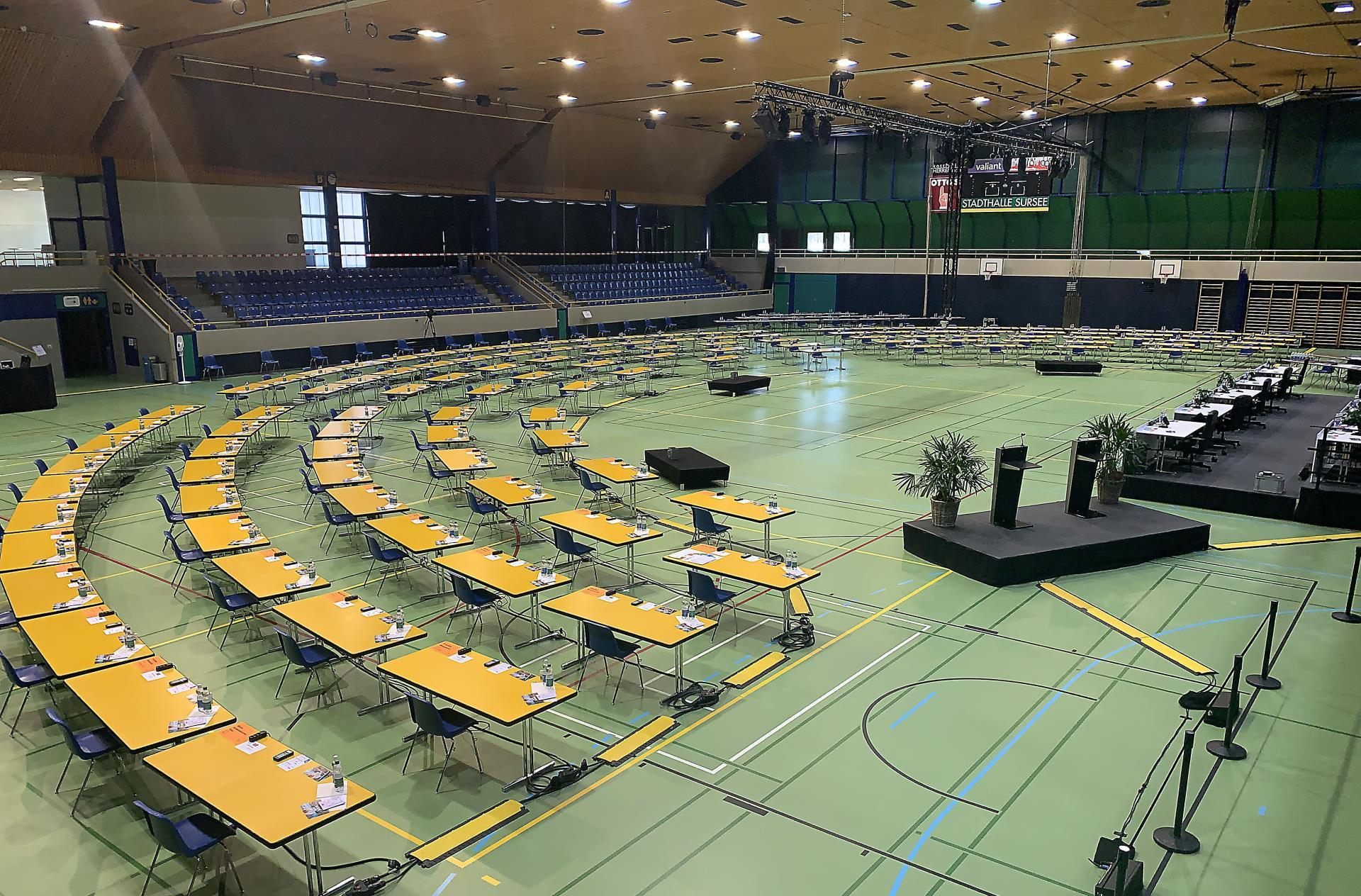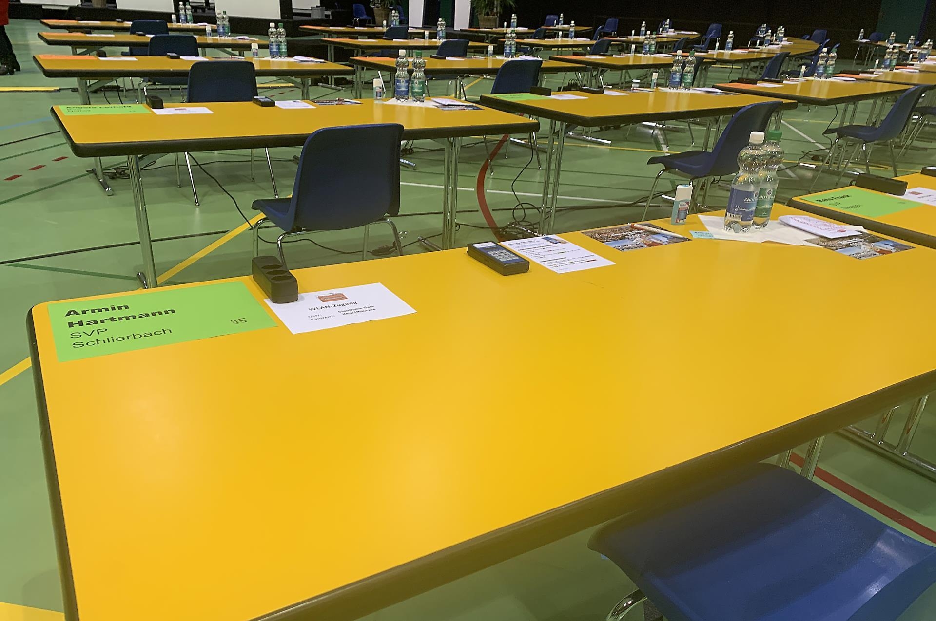 Der Betriebsleiter Stadthalle Sursee hat mit seinem Team die Stadthalle eingerichtet. Jeder Platz der 120 Kantonsräte ist neu ausgerüstet mit einem Gerät für die elektronische Stimmabgabe. In der Messe Luzern standen die Kantonsräte noch wie früher bei Abstimmungen auf. Zudem gibt es Anschlüsse für W-Lan und Strom. Die Stadt Sursee sowie die sechs Surseer Kantonsräte schenken allen Parlamentariern eine süsse Überraschung und zwei Karten von Sursee. Ein Fläschchen Desinfektionsmittel gehört auch zur Tischdekoration. Knutwiler Mineralwasser rundet den Tisch ab.