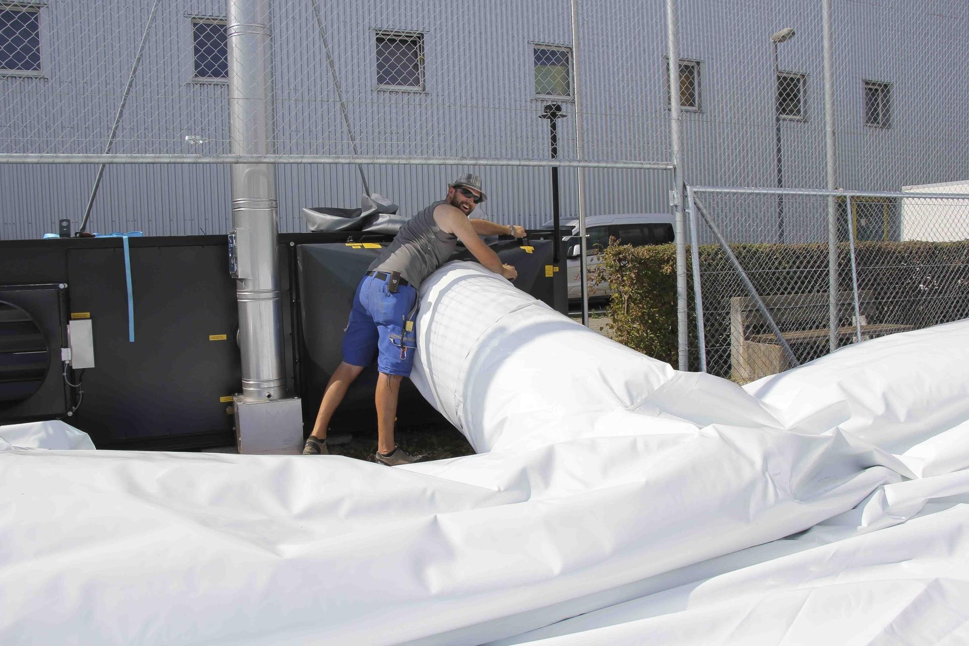 Kurz nach dem Mittag hat Benny Enz (im Bild) von der Firma HP Gasser aus Lungern die neue Traglufthalle an das Gebläse angehängt. Ab diesem Zeitpunkt wuchs die Halle. Schauen Sie den Zeitraffer vom Aufbau der Traglufthalle an – erstellt von Foto Jung aus Sursee.