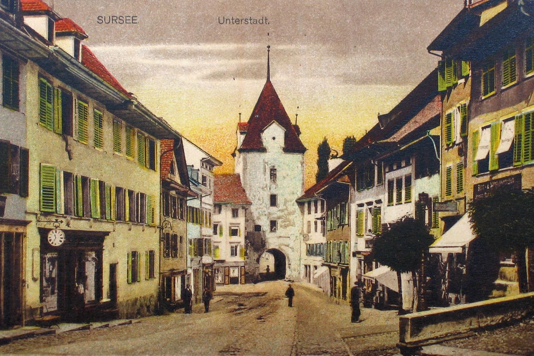 Diese kolorierte Postkarte zeigt die Unterstadt in der Altstadt von Sursee. In der Bildmitte ist das Untertor zu sehen, dass 1674 an Stelle eines mittelalterlichen Stadttores von Meister Thomas Martin von Beromünster errichtet wurde. Die Postkarte trägt den Poststempel vom 20. Mai 1922 und stammt aus der Sammlung von Adolf Feller.