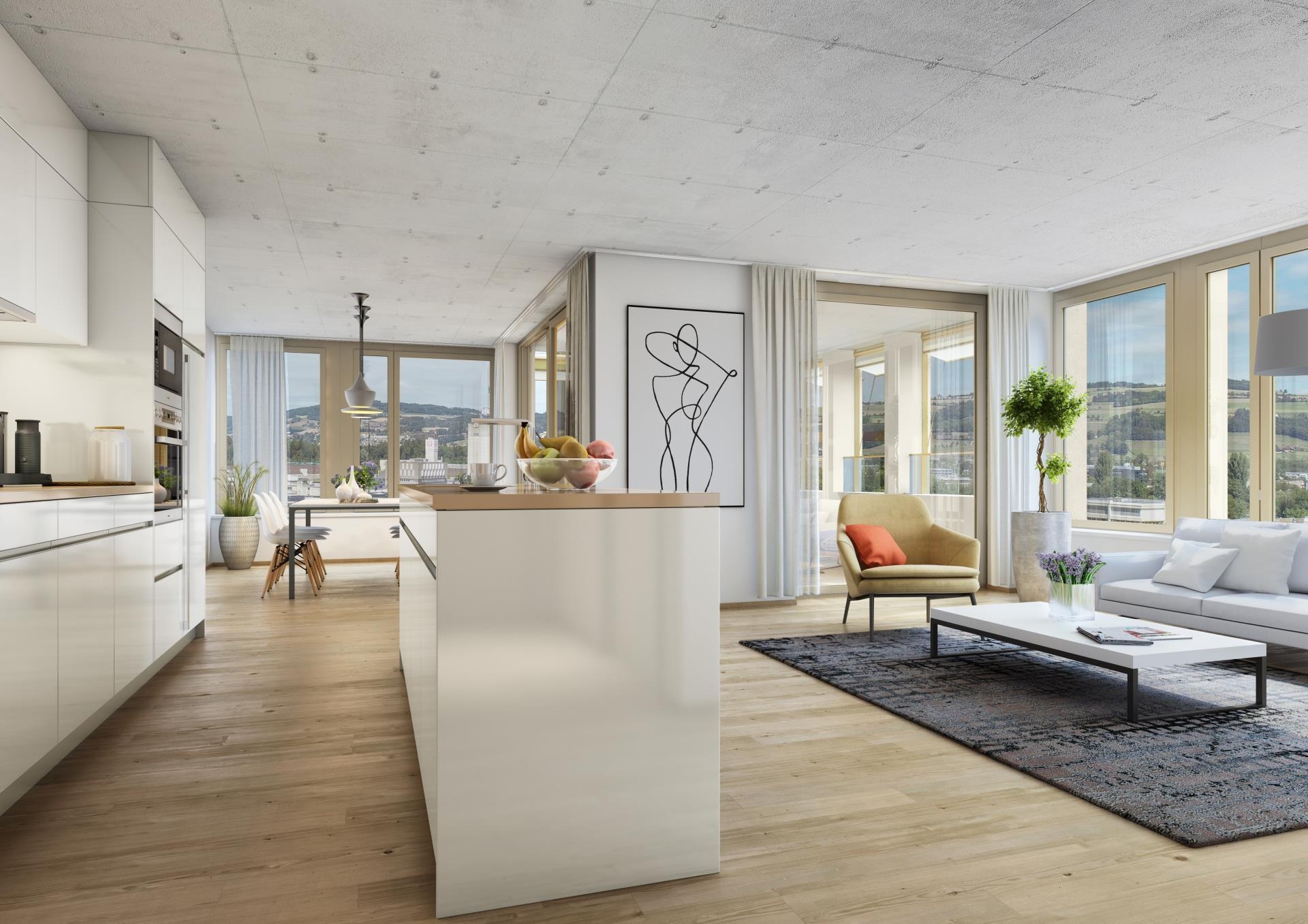 Da die Käufer wie erwähnt lange nicht in die Loggien und die Wohnungen können, haben wir versucht, sämtliche Bedürfnisse visuell per Virtual Reality (VR) und Augmented Reality (AR) abzudecken. Bei der digitalen Wohnungsbesichtigung lassen sich die Möblierung einschalten, die Vermassung einblenden, der Ausblick aus der Loggia betrachten. Das Tool erlaubt zudem, die Besonnung und Beschattung zu zwei verschiedenen Jahreszeiten darzustellen, per 360-Grad-Ansicht.