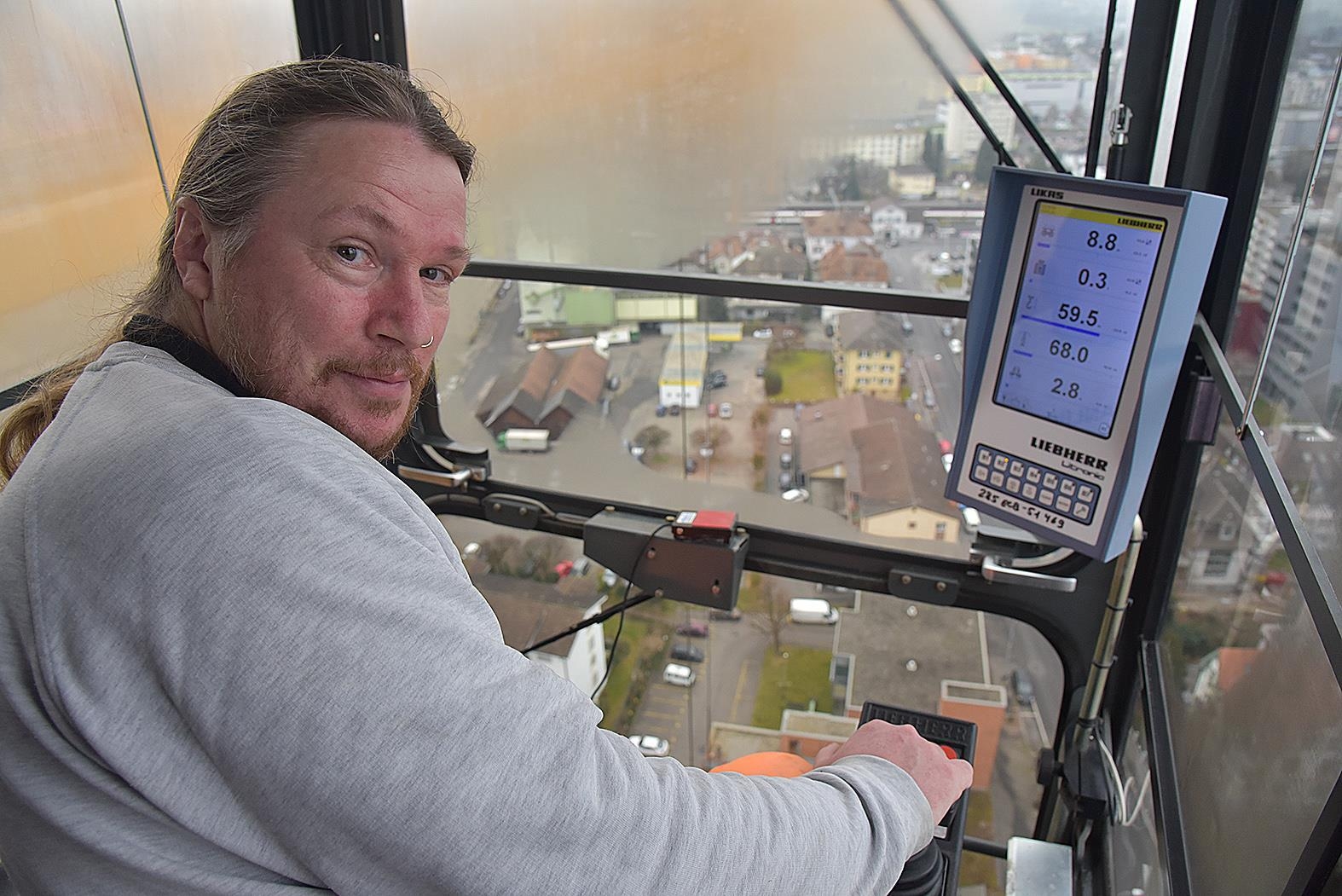 Die beiden Kräne auf der «Dreiklang»-Baustelle sind derzeit die grössten in Sursee. In luftiger Höhe, etwa 74 Meter über Strassenniveau in der Kanzel…