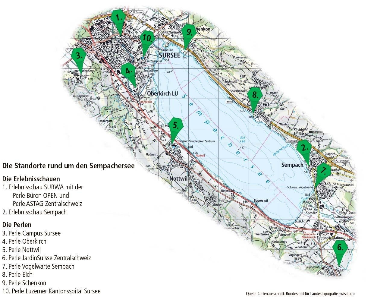 Die Perle in Büron wird von den Mitgliederfirmen von Büron Open gestaltet. Geplant ist ein Erlebnispavillon, welcher mit digitalen und visuellen Elementen bespielt werden soll. Bei der Perle Campus Sursee steht die neueröffnete Sportarena mit dem Schwimmbad im Mittelpunkt. Neben Präsentationen zur Aus- und Weiterbildung am Bau und im Sportbereich, bietet der Campus den Besucherinnen und Besuchern einen Wasser-Erlebnisparcours. Die Perle der Sektion Zentralschweiz des Schweizerischen Nutzfahrzeugverbandes ASTAG findet auf dem Gelände der Erlebnisschau SURWA in Sursee statt. Neben den vielfältigen Weiterbildungsmöglichkeiten aus der Transportbranche stellt das ASTAG verschiedene Berufe und das Thema Sicherheit im Strassenverkehr vor. Beim Luzerner Kantonsspital (LUKS) Sursee wird eine weitere Perle Realität. Das Thema Gesundheit wird unter den Aspekten Bewegung, Ernährung und Prävention aufgegriffen und den Besuchern gezeigt, dass sich im LUKS Mitarbeitende aus über 100 Berufen täglich für die Patienten engagieren. Bei der Perle in Schenkon sind die Gewerbetreibenden, die Schulen und Kindergärten gemeinsam künstlerisch unterwegs. Unter dem Motto BOXEN STOPP präsentieren sich die Macher innerhalb von 60 bis 80 Boxen, welche aus gestalteten Holzpaletten bestehen. Da die Ausstellung im Park stattfindet wird diese mit Sitzgelegenheiten und einer Grill-Landschaft gemütlich ausgestaltet. Für den Co-Projektleiter von Dynamo Sempachersee, Beat Heuberger, ist die Entwicklung der einzelnen Perlen erfreulich. „Die lokalen Organisationskomitees haben sich organisiert und kreieren nun spannende und überraschende Inhalte für die einzelnen Perlen“. Weitere Perlenstandorte sind in Diskussion oder bereits in Planung in Oberkirch, Eich und bei der Vogelwarte in Sempach.