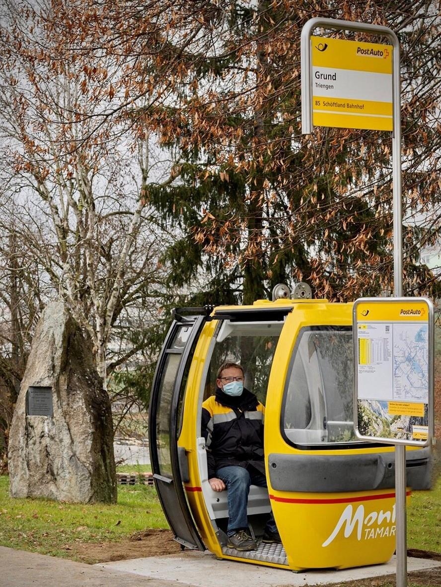 Eine Gondel vom Monte Tamaro im Tessin erhält ein zweites Leben als Wartehäuschen für die Postauto-Fahrgäste in Triengen. Der Monte Tamaro ist ein beliebtes Ausflugsziel zwischen Locarno und Lugano. Vom Ort Rivera aus befördert eine Gondelbahn die Ausflügler bequem auf den knapp 2000 m hohen Berg. Zwei dieser Tessiner Gondeln hat Postauto von der Monte Tamaro SA übernommen.