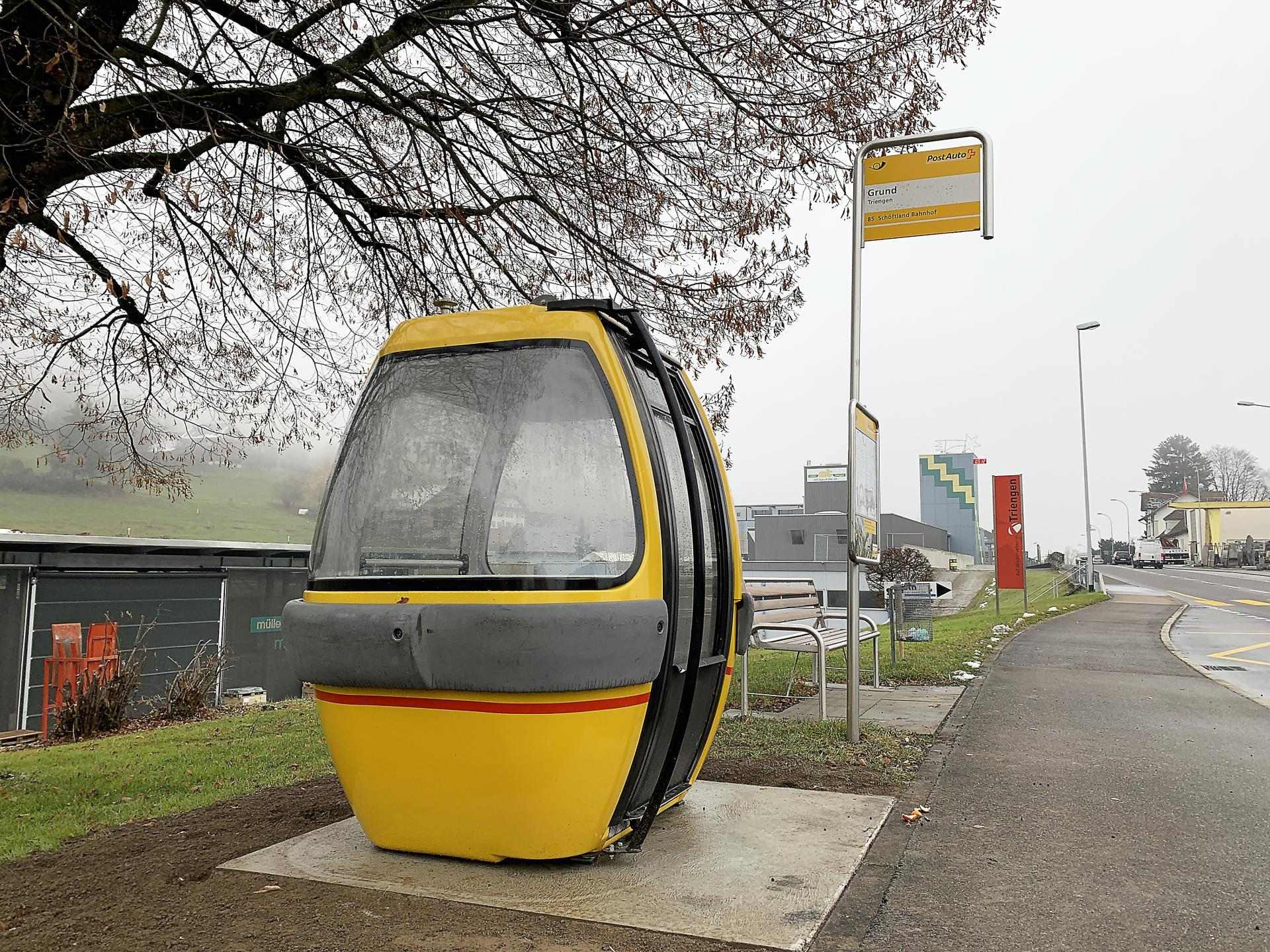 Die zweite Gondel kommt nun in Triengen im Luzerner Surental zum Einsatz. An der Haltestelle Triengen, Grund wird sie den Fahrgästen ab Fahrplanwechsel vom 13. Dezember 2020 als Wartehäuschen zur Verfügung stehen. Bisher hatte die Haltestelle keinen geschützten Unterstand.