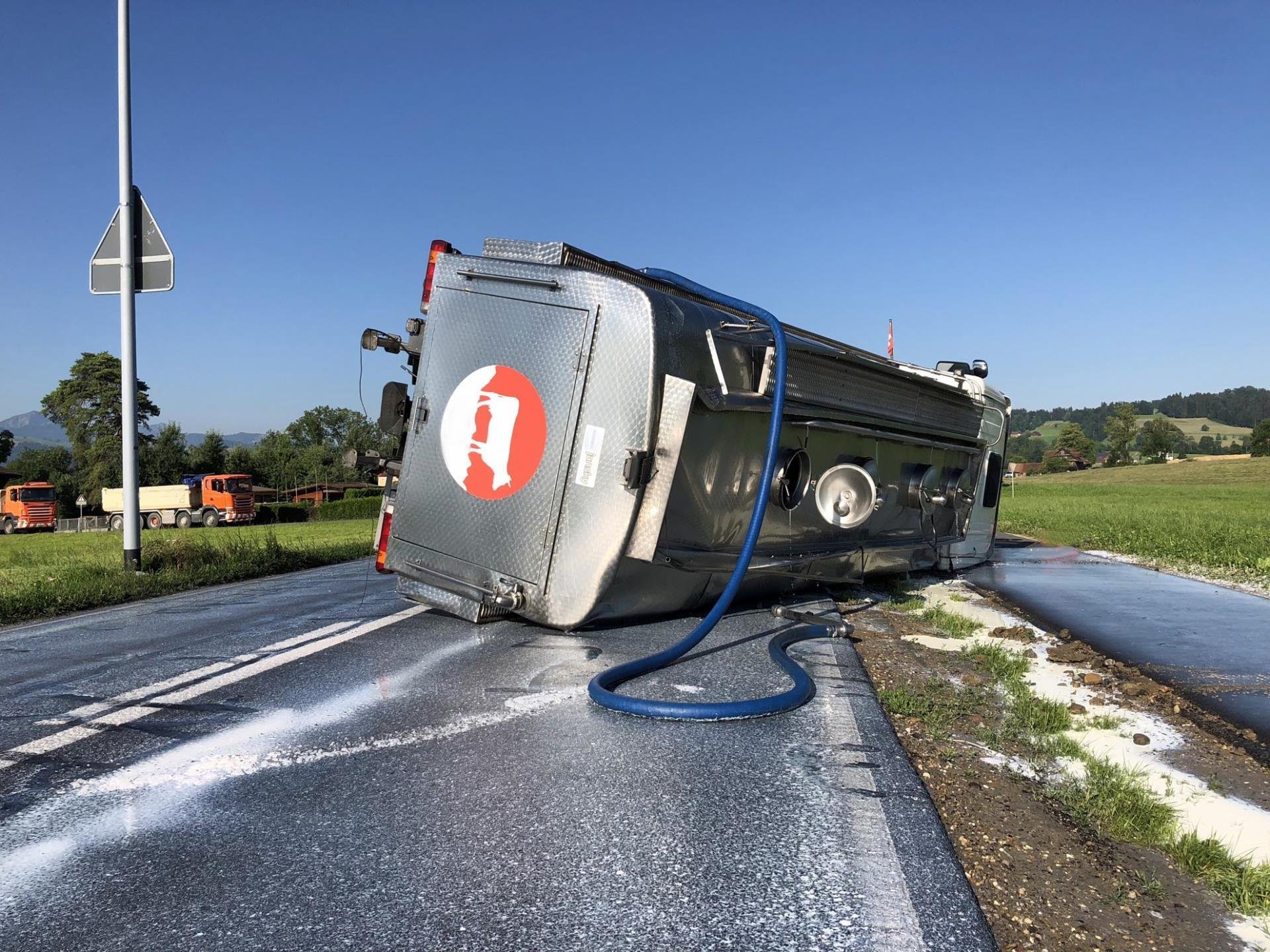 Am Mittwochmorgen, 20. Juni, um 8 Uhr, fuhr ein Milchtransporter auf der Ruswilerstrasse von Hellbühl in Richtung Rothenburg. Bei der Liegenschaft Oberstechenrain ist er in zwei Kandelaber am Strassenrand gefahren und kippte kurz danach in die Strassenmitte zur Seite. In der Folge sind ungefähr 8 Kubik Milch auf Strasse, Wiese und in den Rotbach ausgelaufen. Der Chauffeur wurde zur Kontrolle ins Spital gebracht. Es entstand Sachschaden in der Höhe von mehreren 10'000 Franken.