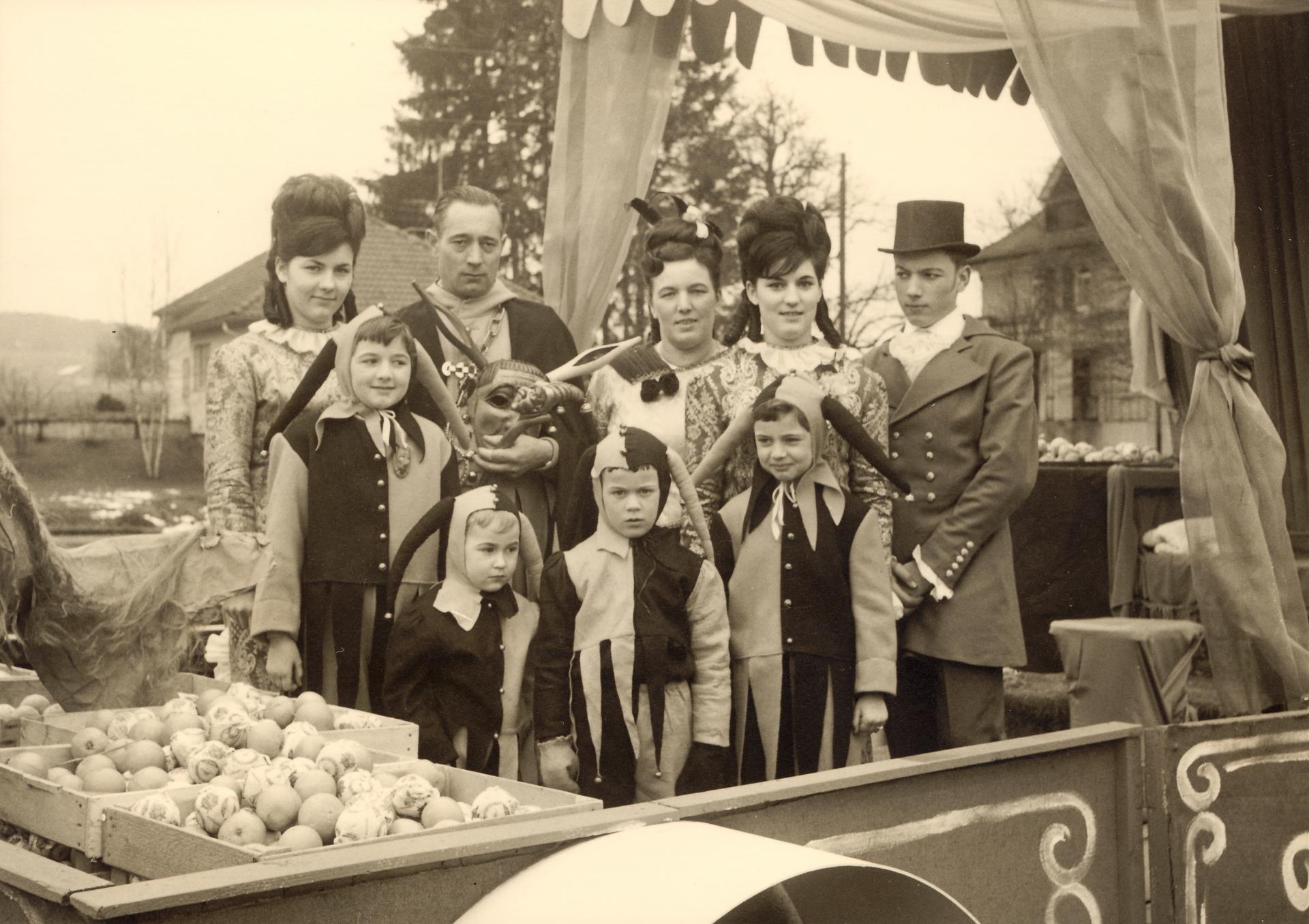 Der Fasnachtsumzug durch Sursee 1967. Nach Informationen eines Lesers handelt es sich beim Heinivater um Emil Fischer und seine Familie. Die Namen der Heinimamme und der Heinigoofen sind unbekannt.