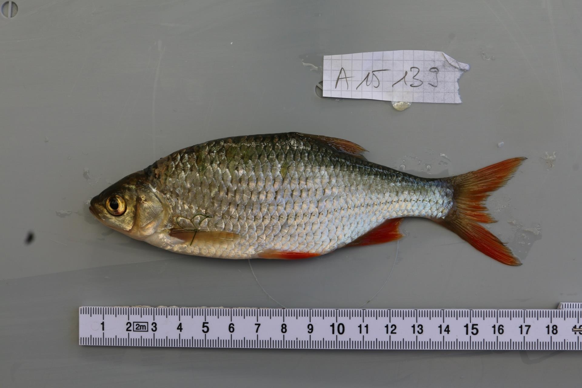 Bild einer Rotfeder auf dem Messtisch. Von dieser Fischart wurden insgesamt 312 Stück gefangen. Rotfedern wurden zahlenmässig am sechsthäufigsten gefangen. (Foto Pascal Vonlanthen)