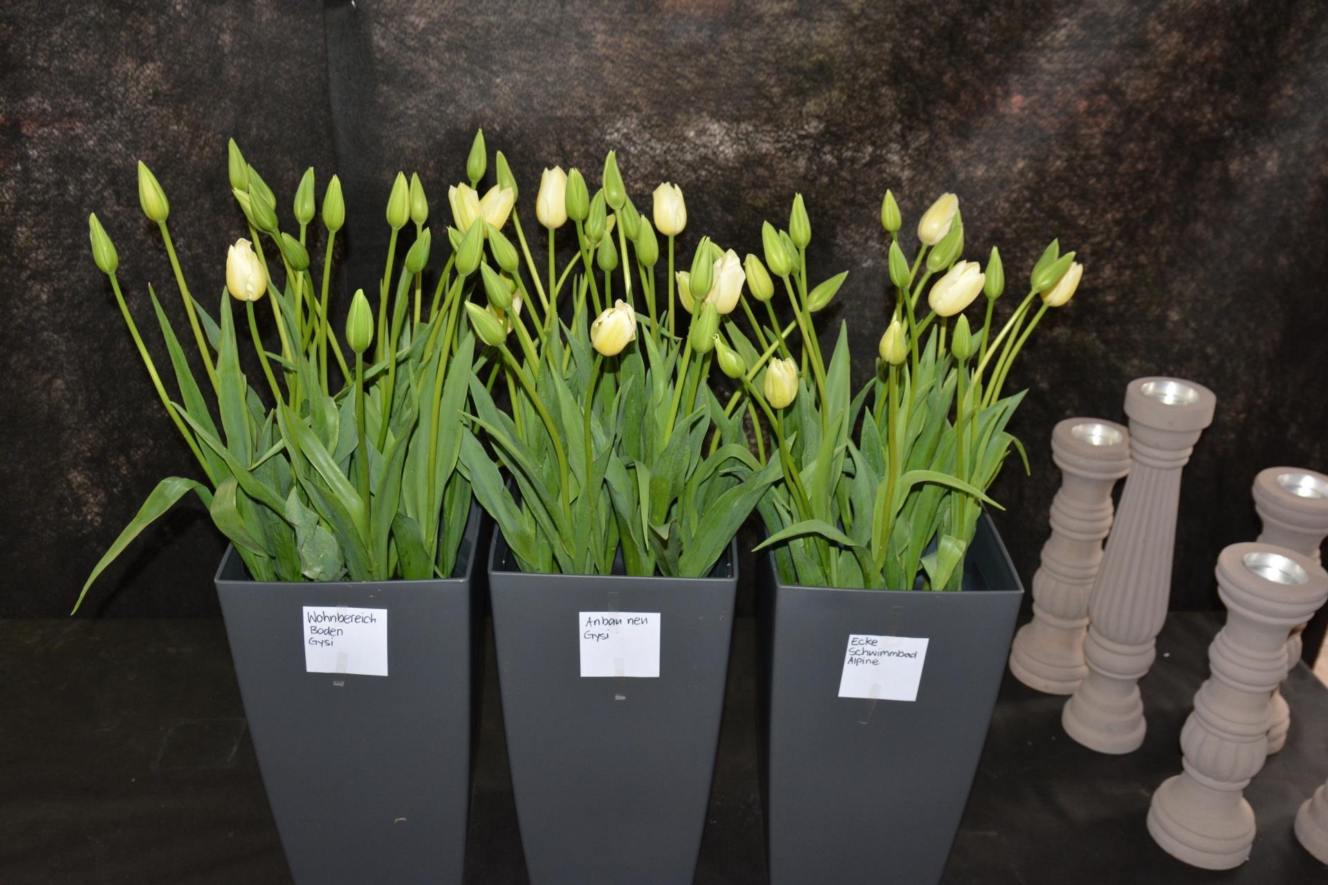 Alle Blumentöpfe und -gefässe haben einen Zettel, auf dem steht, an welcher Stelle sie in Davos aufgestellt werden sollen. Céline Schaller erarbeitete das Konzept anhand von Fotos. Sie wäre gerne vor Ort, um die Blumen in den beiden Häusern anzuschauen. Im Bild Tulpen aus italienischer Zucht, die am Freitagmorgen angeliefert wurden.