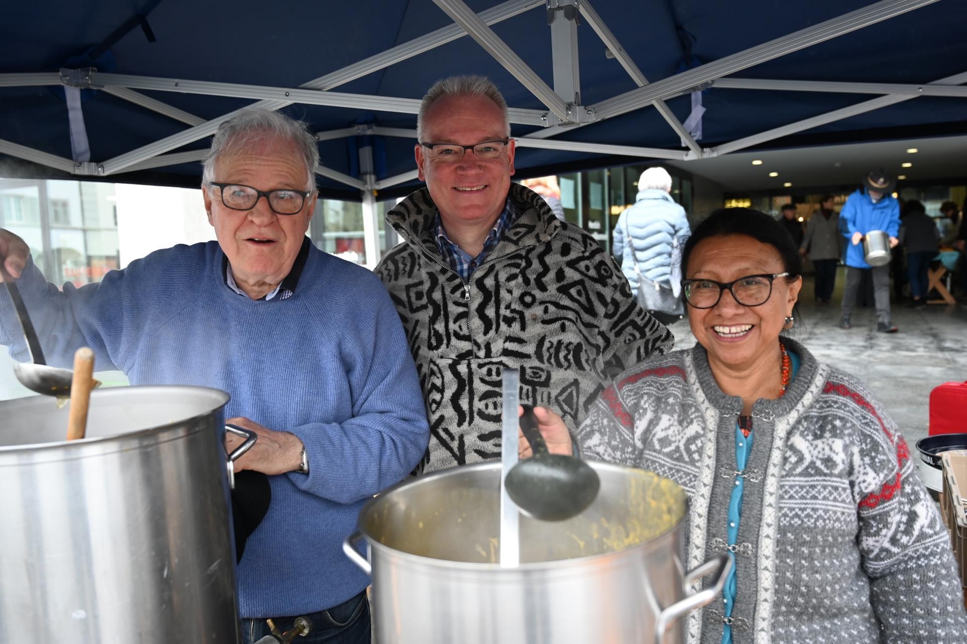 Ein verlockend feiner Geruch lag am Freitag beim Martigny-Platz in Sursee in der Luft. Und wer dem Geruch folgte konnte auch der Gemüse- oder Kürbissuppe nicht widerstehen, die serviert wurde. Inés Peréz Hernández und Kurt Heimann sowie Claudio Tomassini schöpften den Gästen die Suppe. Auch genossen die Anwesenden einige entspannende Momente bei Suppe, Brot, Apfelkuchen und Tee.
