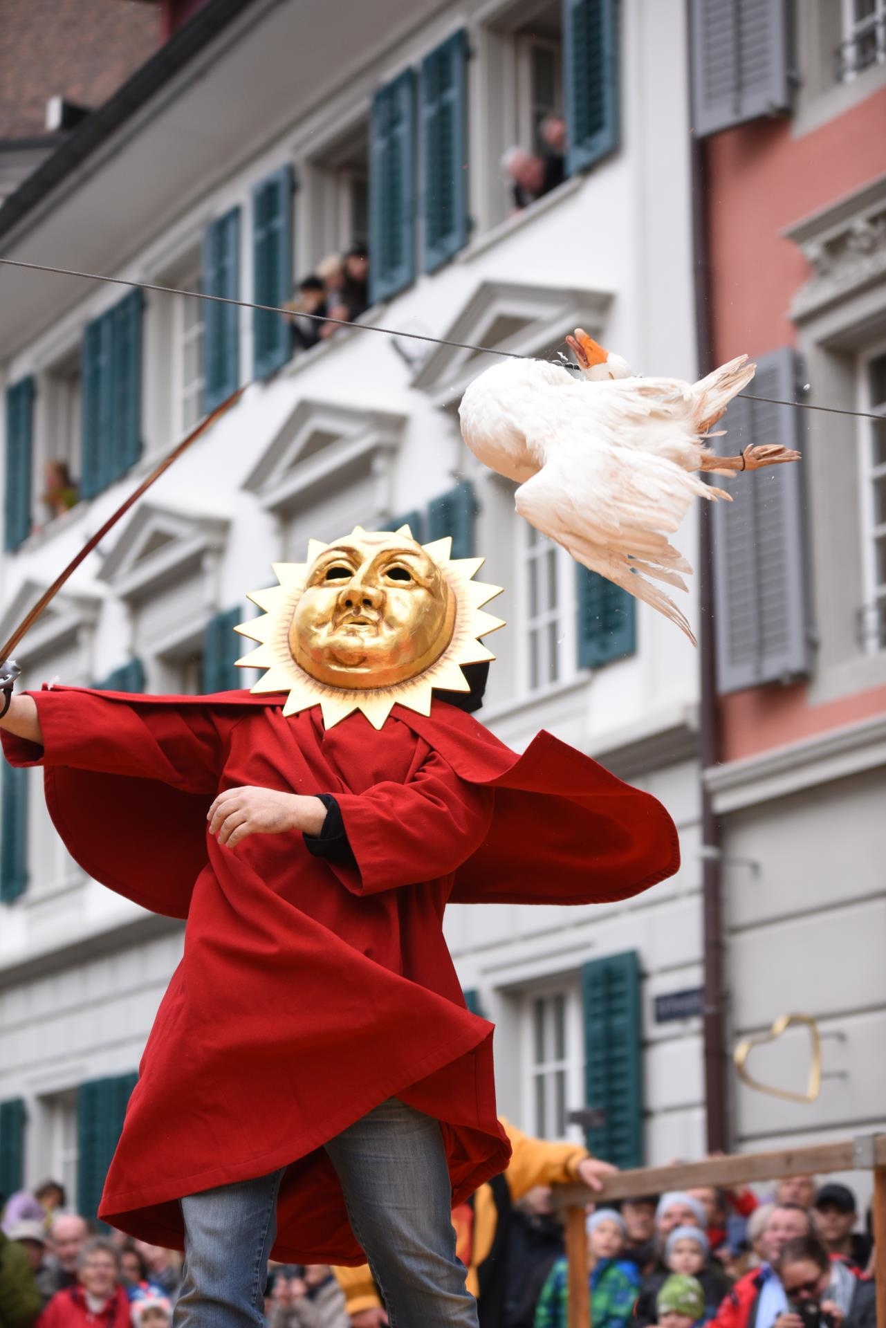 20 Minuten dauerte es 2018, bis nach vier Schlägen die beiden Gänse geköpft waren. Nicht ganz so rekordverdächtig, aber trotzdem schnell sicherte sich der siebte Schläger die zweite Gans. Giovanni Valetti, ein Zünftiger, durfte die begehrte Trophäe nach Hause nehmen.