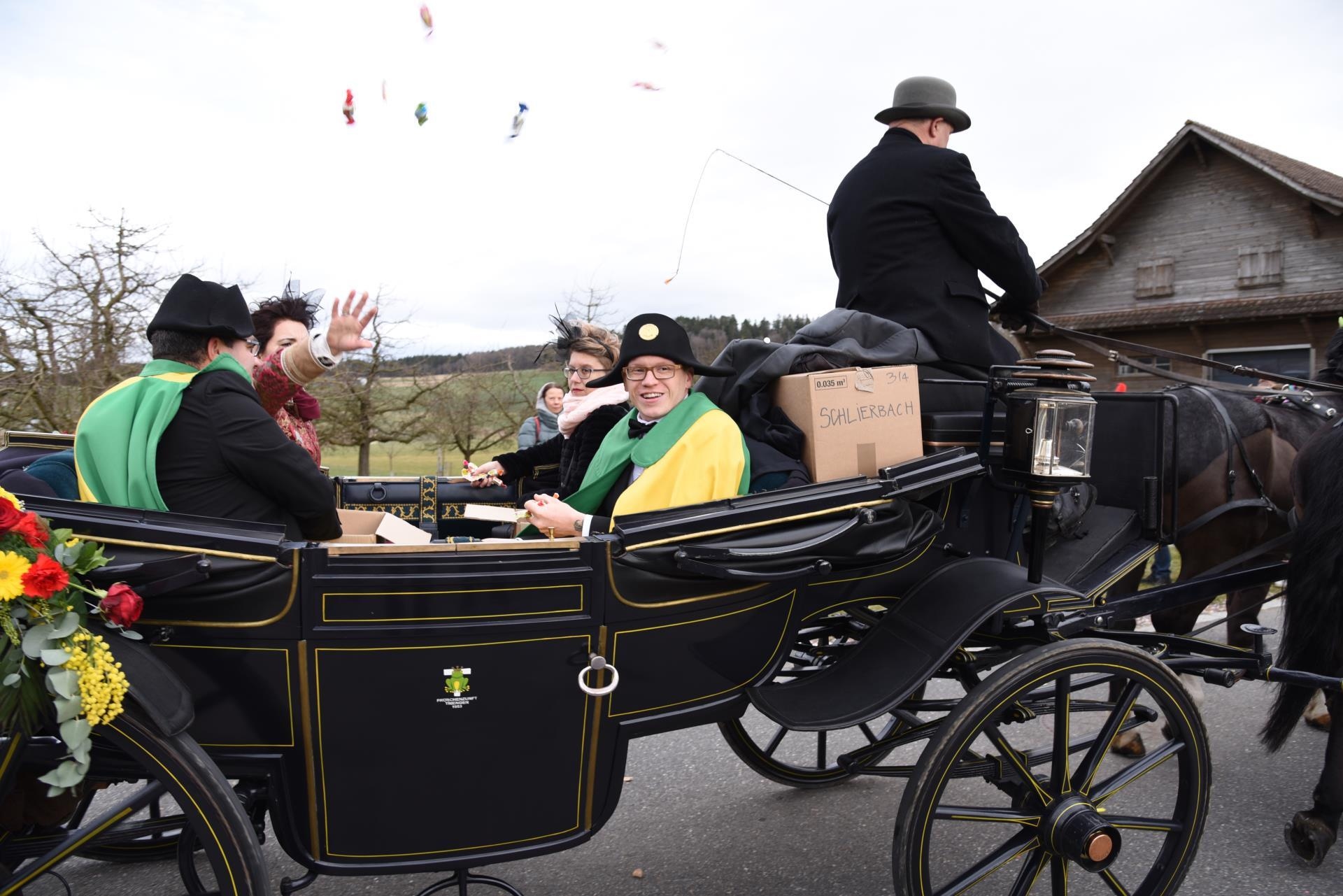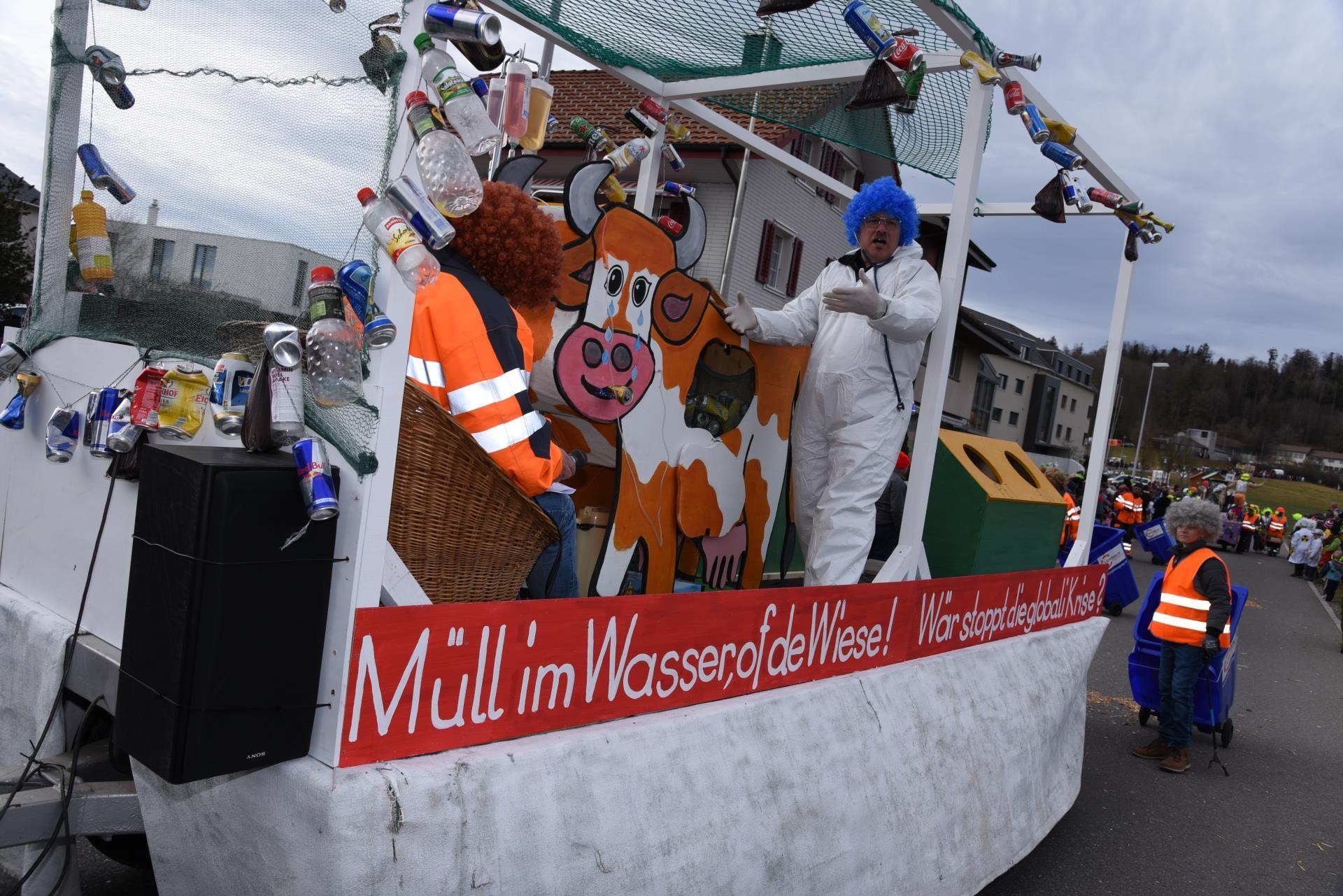 Auch die Roggenzunft selber schaffte es mit ihrem prächtigen blauen Wagen nicht, das widerspenstige Tier zu fangen. Was auch immer wieder die Köpfe schütteln lässt, ist das leide Thema des weggeworfenen Abfalls durch geöffnete Autofenster, worunter vor allem Kühe auf den Wiesen zu leiden haben. Das Jodlerchörli «Heimelig am Gschweich» hielt der Gesellschaft unmissverständlich den Spiegel hin.