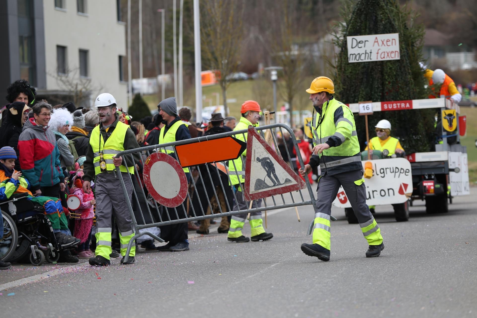 Die beste Armee der Welt, schon mal so bezeichnet worden durch einen Magistraten in Bern, besitzt doch bestimmt auch die beste Luftwaffe. Mitnichten, sagte die Gruppe «Usrangschiert», welche einen FA18 präsentiert und es eigentlich noch schätzen würde, wenn dieses Ding anstelle der langen Mängelliste doch einfach fliegen würde. Ein weiteres Beleg helvetischer Unpässlichkeiten war die Axenstrasse. Hierbei war es jedoch der unruhige Berg, der die Strasse immer wieder blockierte, wie die Trychlergruppe Büron mit ihrem «Der Axen macht Faxen» vor Augen führte.