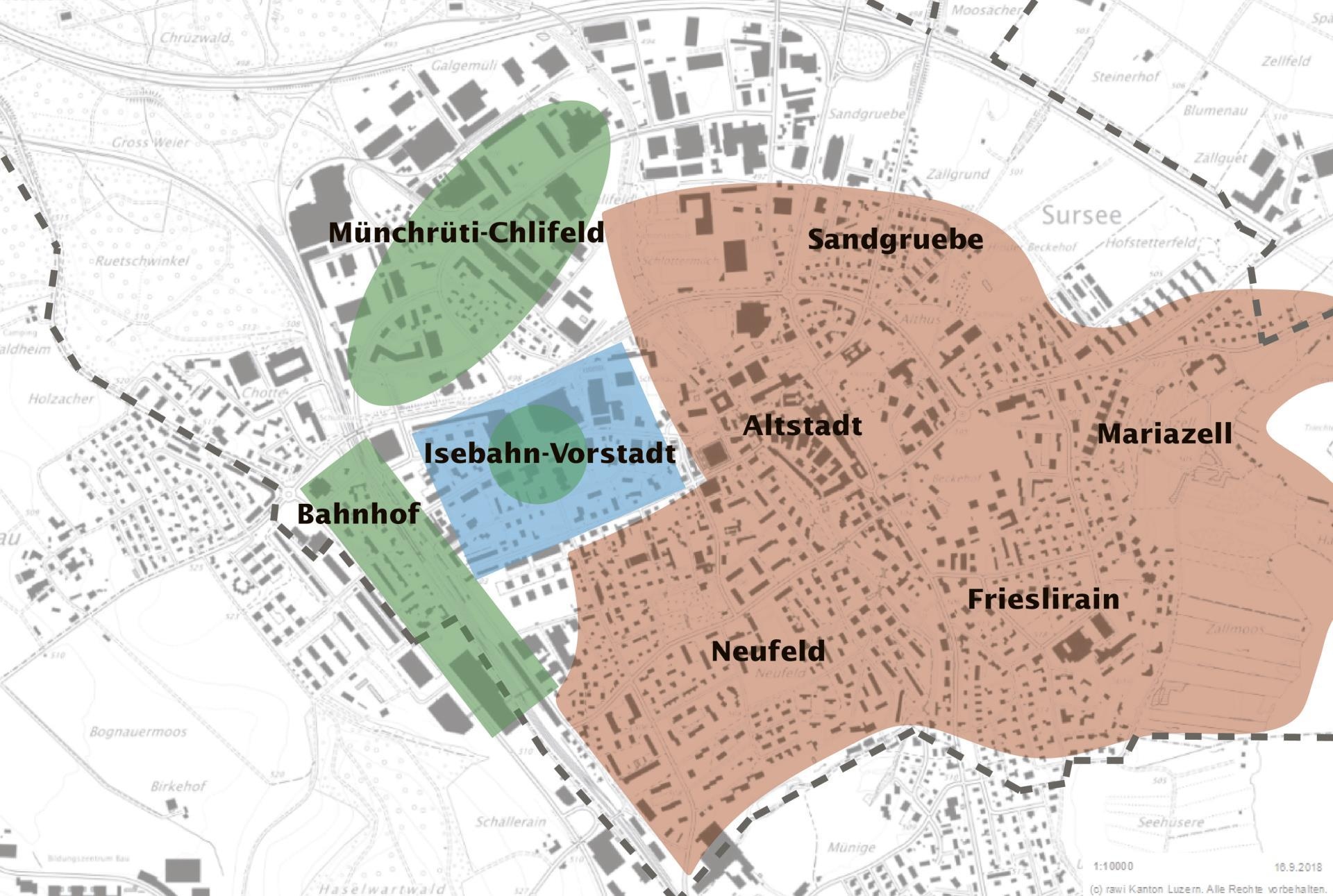 Die Isebahn-Vorstadt (blau) ist ein Potenzialgebiet für Höhere Häuser. In den Gebieten Bahnhof, Münchrüti-Chlifeld sowie dort, wo der Lukb-«Dreiklang» zu stehen kommt (grün), sind Hochhäuser denkbar.