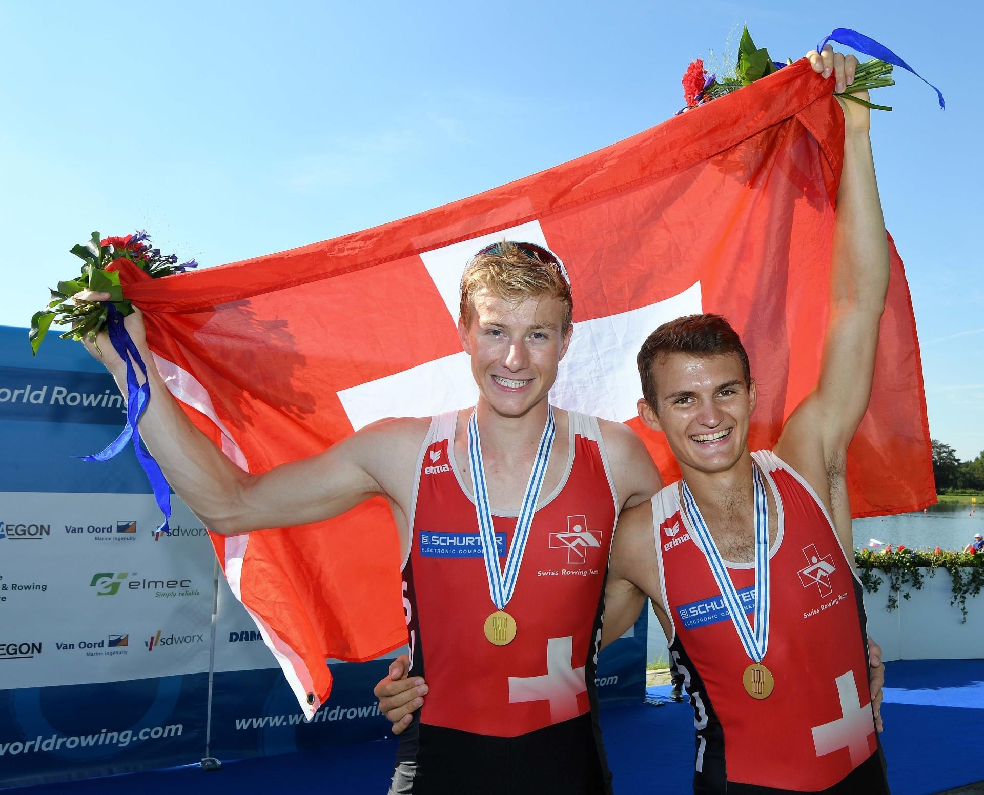 Eben erst an den Olympischen Spielen als Ersatzleute des siegreichen Vierer ohne Steuermann Leichtgewichte im Einsatz, stand heute für Joel Schürch (SC Sursee) und Fiorin Rüedi (GC Zürich) ihr Saisonhöhepunkt auf dem Programm: Der Final im leichten Zweier ohne Steuermann an den U23-Weltmeisterschaften. Mit einem cleveren und eindrücklichen Rennen ruderte das Duo zu Gold. Joel Schürch freute sich: «Unser Rennplan ist genau aufgegangen.» Geholfen hätten auch einige geheime Tipps, die Simon ihm am Vorabend des Finals noch mitgegeben habe. Die Tempoverschärfung bei Streckenhälfte erinnerte denn auch stark an die Rennstrategie des leichten Vierers und die bis dahin führenden Griechen hatten keine Chance zu reagieren. Dieses griechische Duo, Stefanos Ntouskos, Ioannis Petrou, holte nicht nur Bronze im Vorjahr, sondern war auch an den Olympischen Spielen im leichten Vierer im Einsatz und wurden mit ihren Kollegen Sechste.